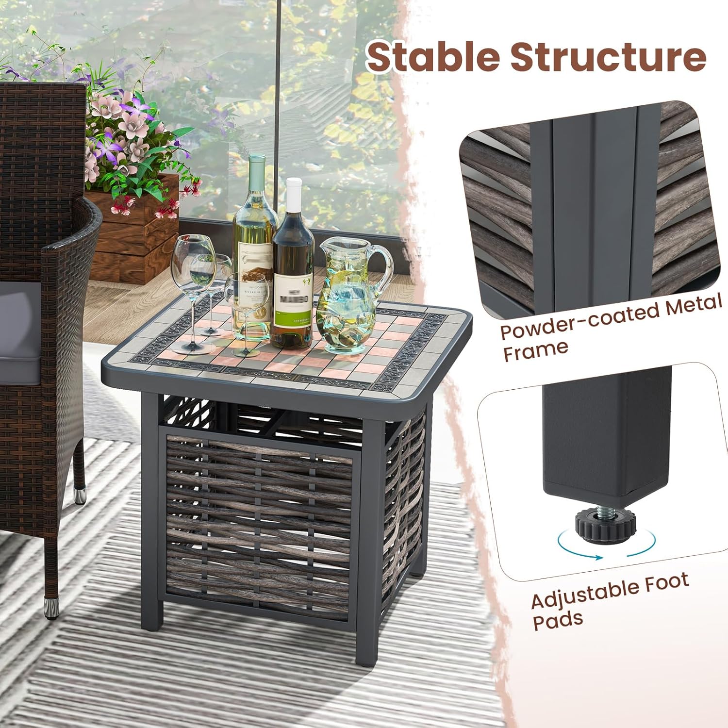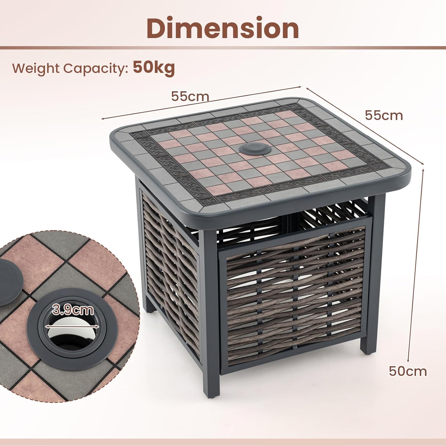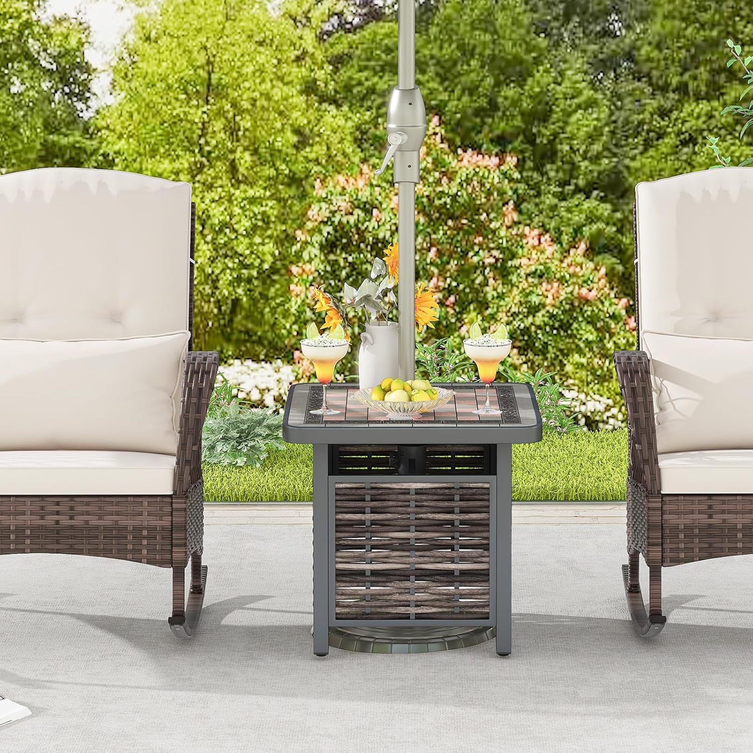 - Trou de Parasol Intégré - Conçue avec un trou de parasol pour accueillir votre parasol de terrasse, cette table d'appoint carrée vous permet de profiter de l'ombre et d’avoir une protection contre le soleil tout en vous relaxant à l'extérieur. Le dispositif de fixation inférieur maintient le parasol en place.