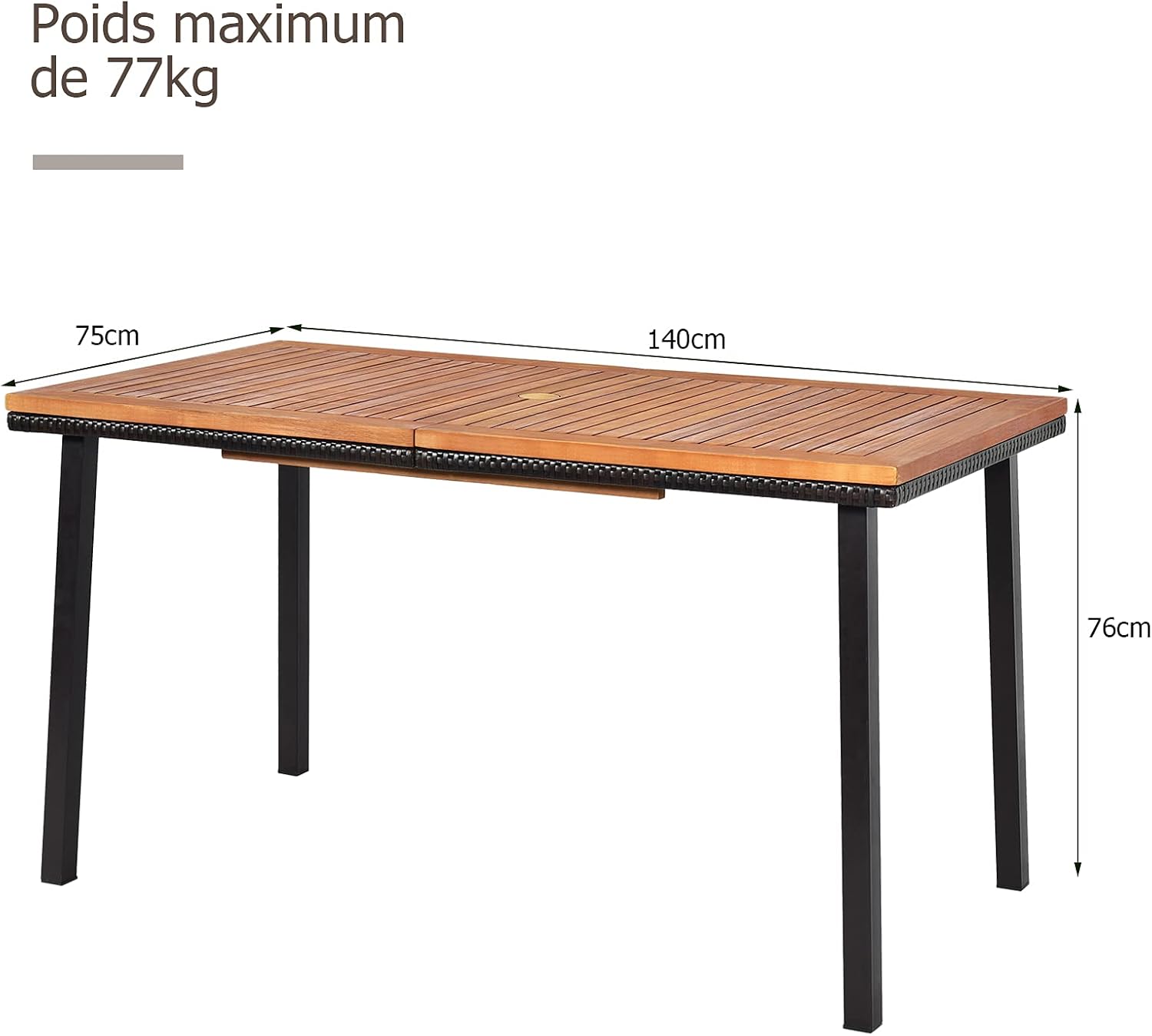 • Table jardin pratique : Avec une surface de 140×75 cm, notre table est assez grande pour mettre des articles, en ayant le trou de parasol, ce qui est idéal pour l'usage extérieur, tel que le pique-nique ou la réunion de la famille.