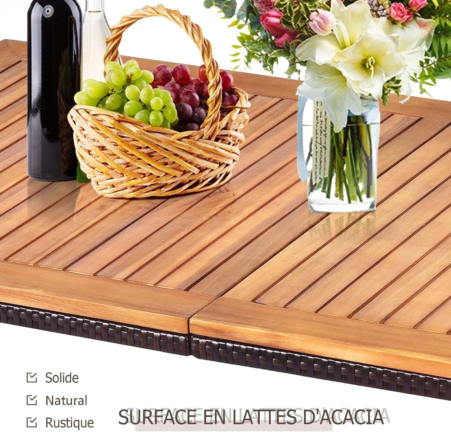 • Apparence unique : La surface en bois avec ses textures claires et la bordure en osier toutes saisons de notre table de jardin extérieur ajoutent de la légèreté et d'une touche d'élégance dans le décor global de votre maison.