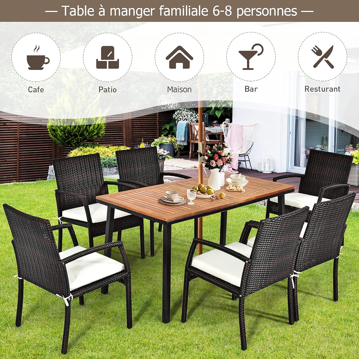 Table de jardin extérieur, table à manger en bois avec trou de parasol, idéal pour terrasse, patio, cour,