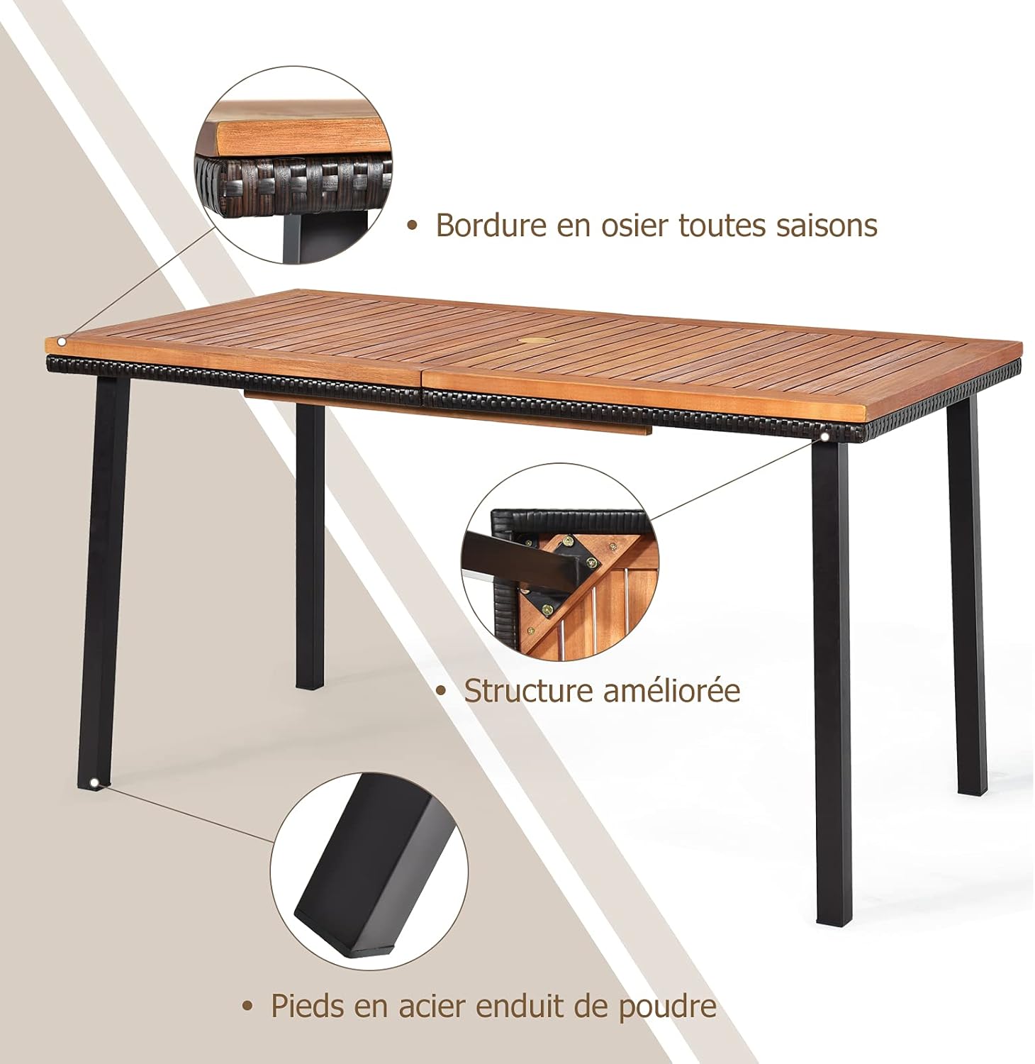 Libellé Table de jardin extérieur, table à manger en bois avec trou de parasol, idéal pour terrasse, patio, cour, piscine