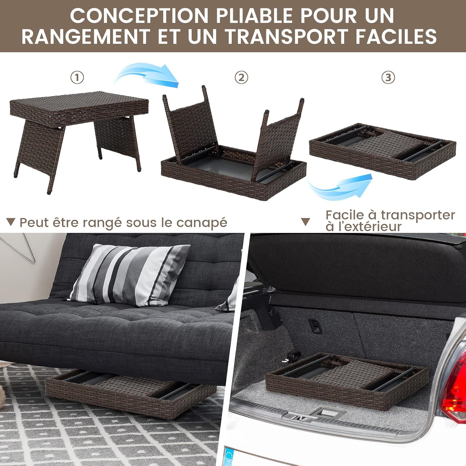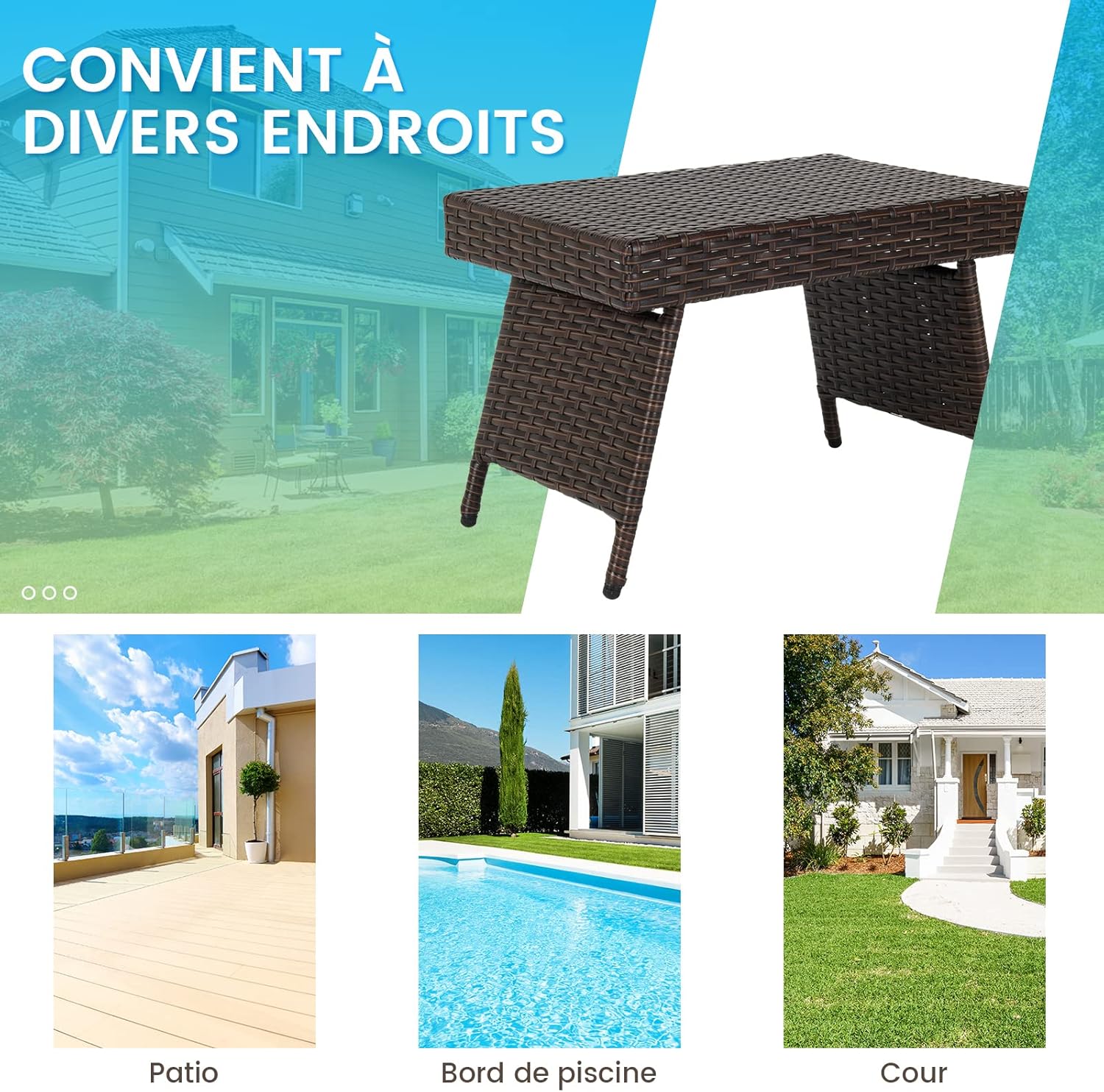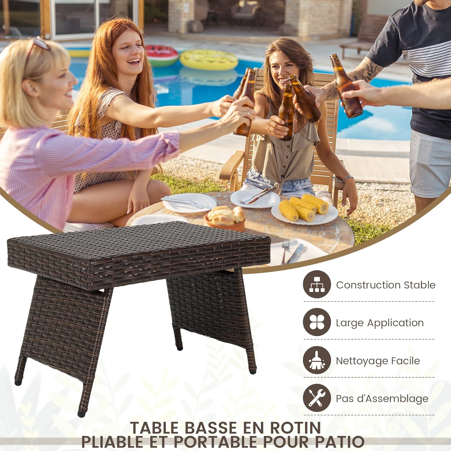 Table de jardin pliable en résine, table basse tressée avec pieds ajustables, table d'appoint pliante