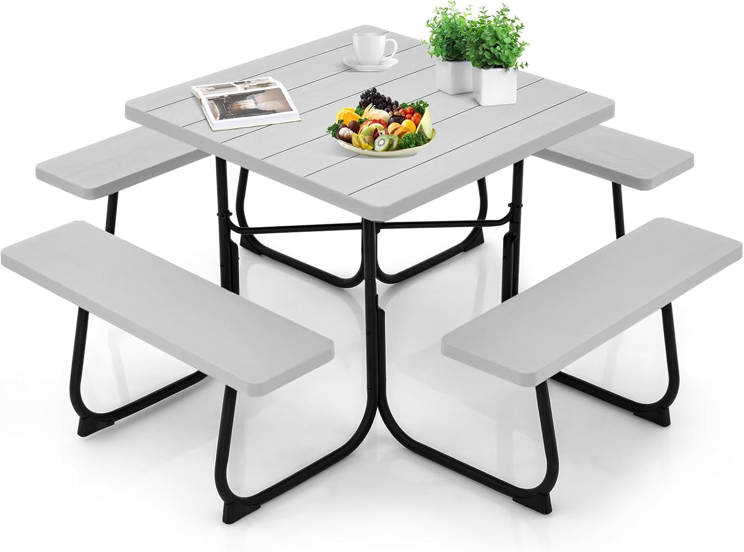 Notre ensemble de table carrée de pique-nique avec 4 bancs intégrés peut accueillir votre parasol avec un trou pour parasol de 4,8 cm. Vous pouvez donc manger et discuter confortablement. De plus, les larges bancs confèrent suffisamment d'espace pour accueillir jusqu'à 4 à 8 personnes. Ne vous inquiétez pas pour la stabilité. Le cadre en métal robuste confère à cet ensemble une forte capacité portante (135 kg pour la table et 225 kg pour chaque banc). De plus, le matériau HDPE robuste résiste aux éléments extérieurs tout en facilitant un entretien simple.