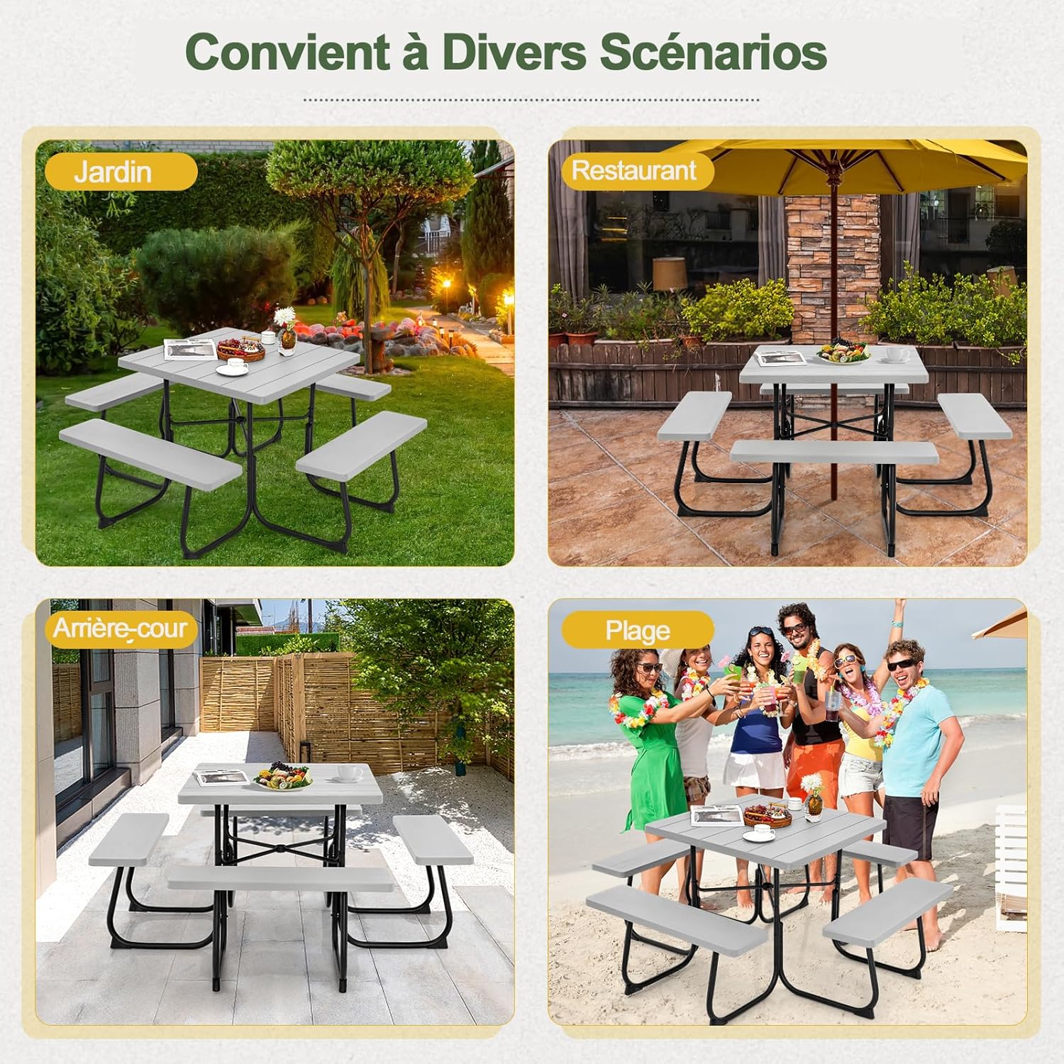 Table de pique-nique avec 4 bancs intégrés pour 4 à 8 personnes, table de jardin en HDPE avec trou pour p