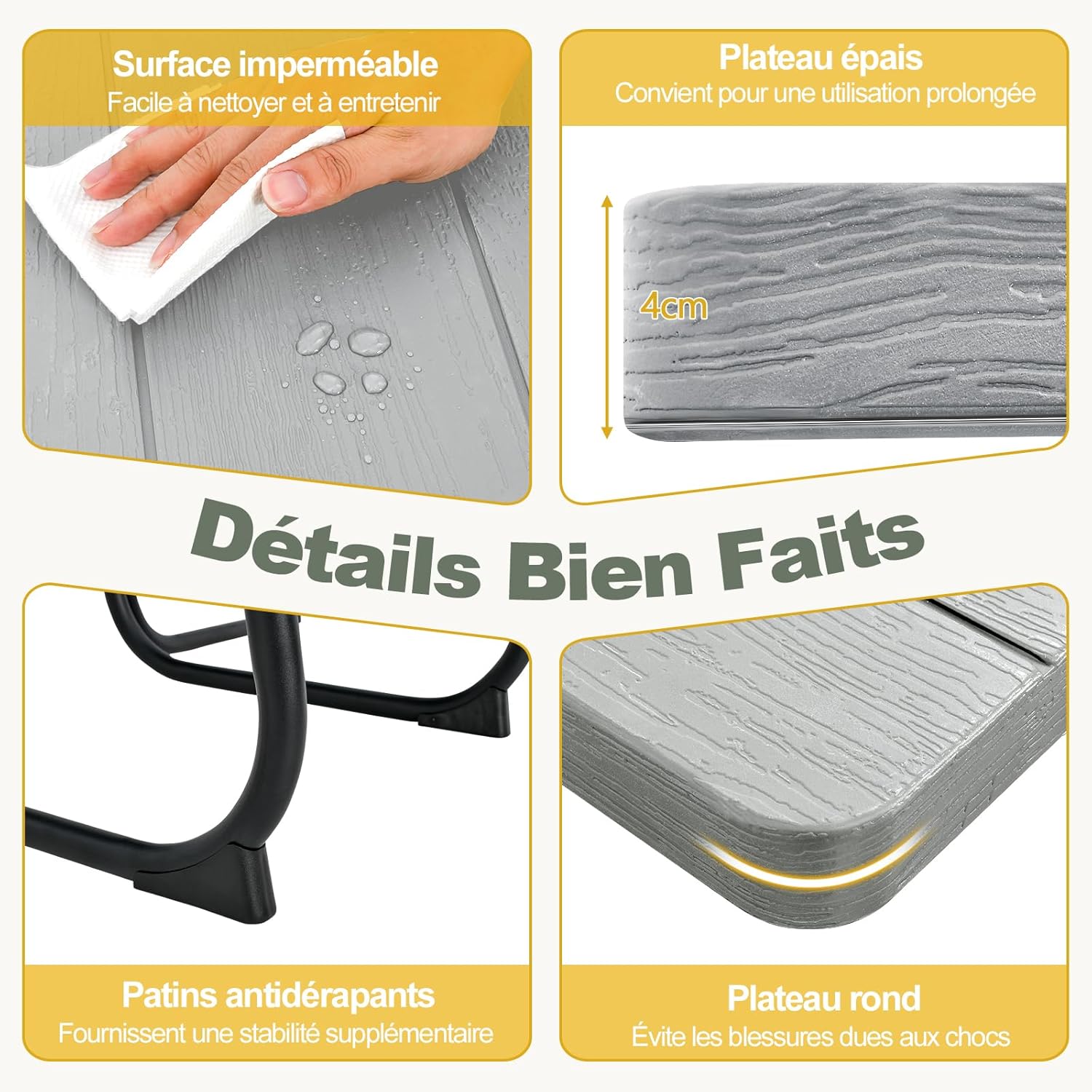 | Libellé | Table de pique-nique avec 4 bancs intégrés pour 4 à 8 personnes, table de jardin en HDPE avec trou pour parasol, table de camping carrée en plein air |