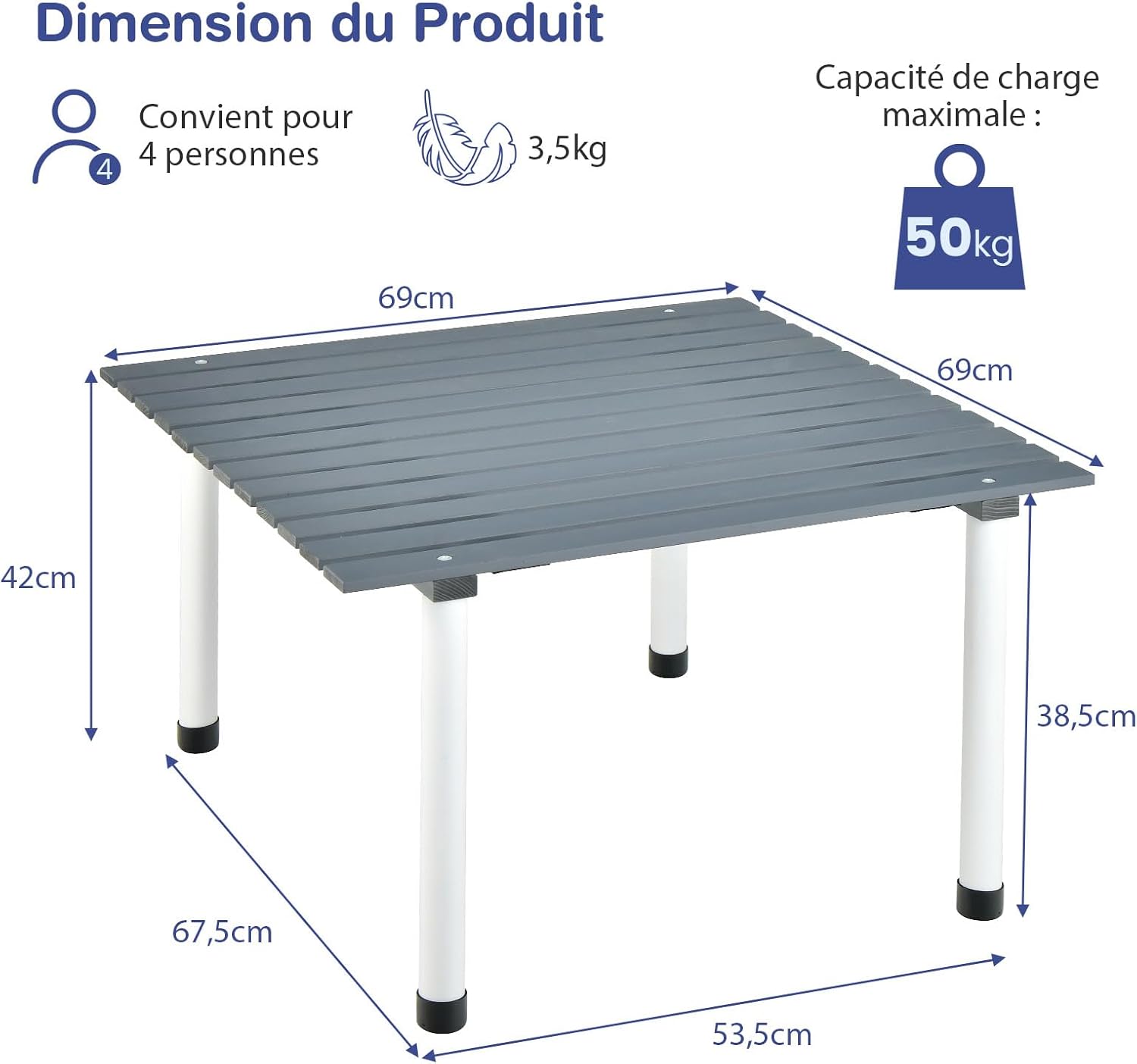 Le plateau de 69 cm x 69 cm (L x l) vous permet de prendre des repas en famille ou entre amis en plein air