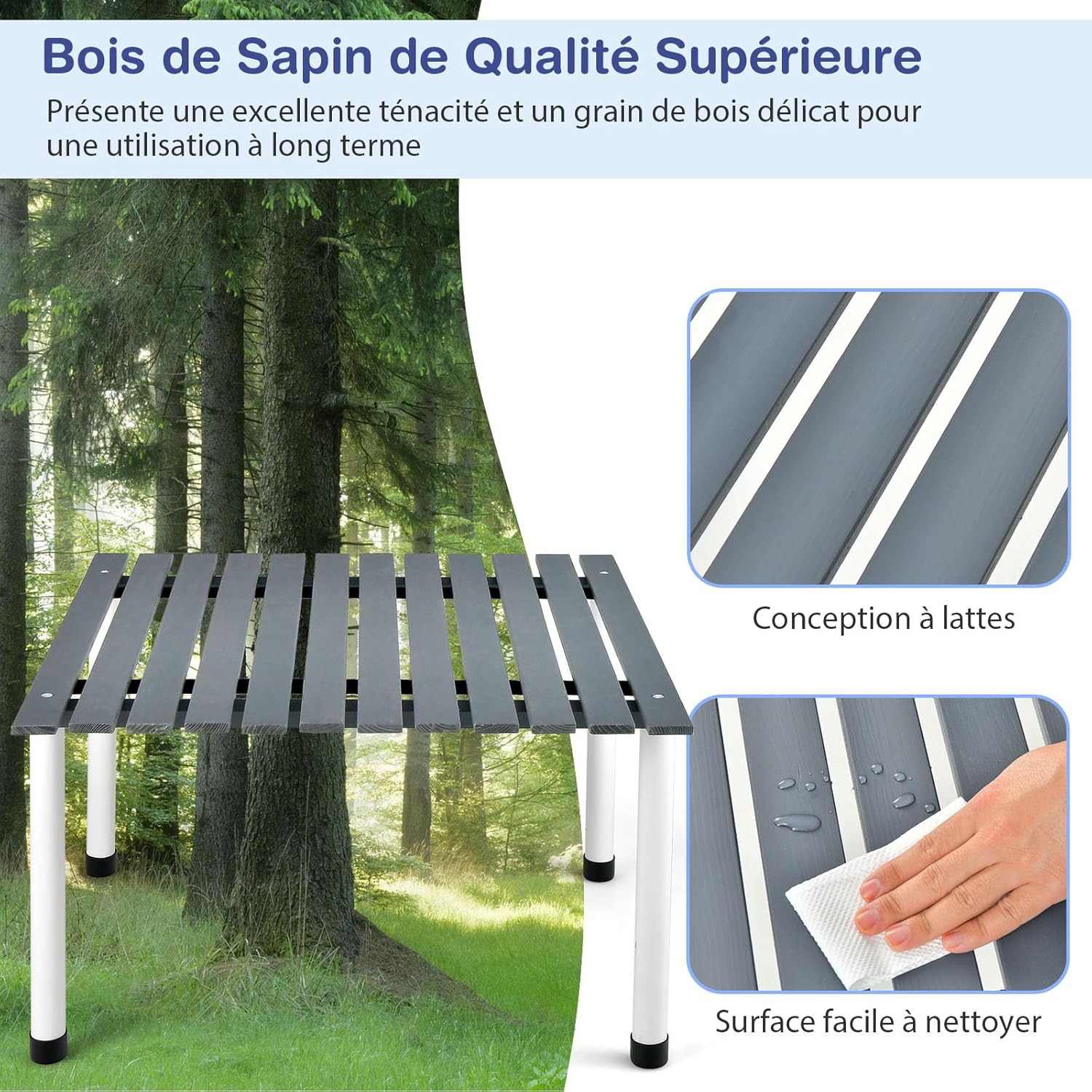 Le bois de sapin de qualité supérieure présente une excellente résistance et un grain de bois délicat pour une utilisation à long terme
