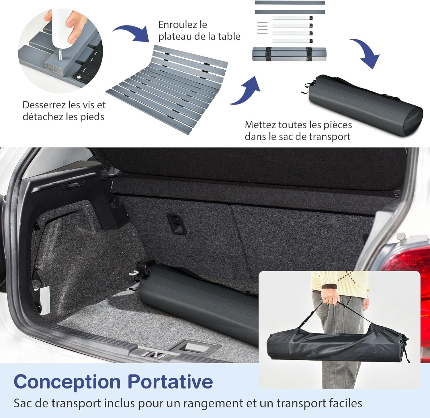Libellé Table de pique-nique pliable, table de camping de voyage enroulable en bois avec sac de transport, légère portable, gris