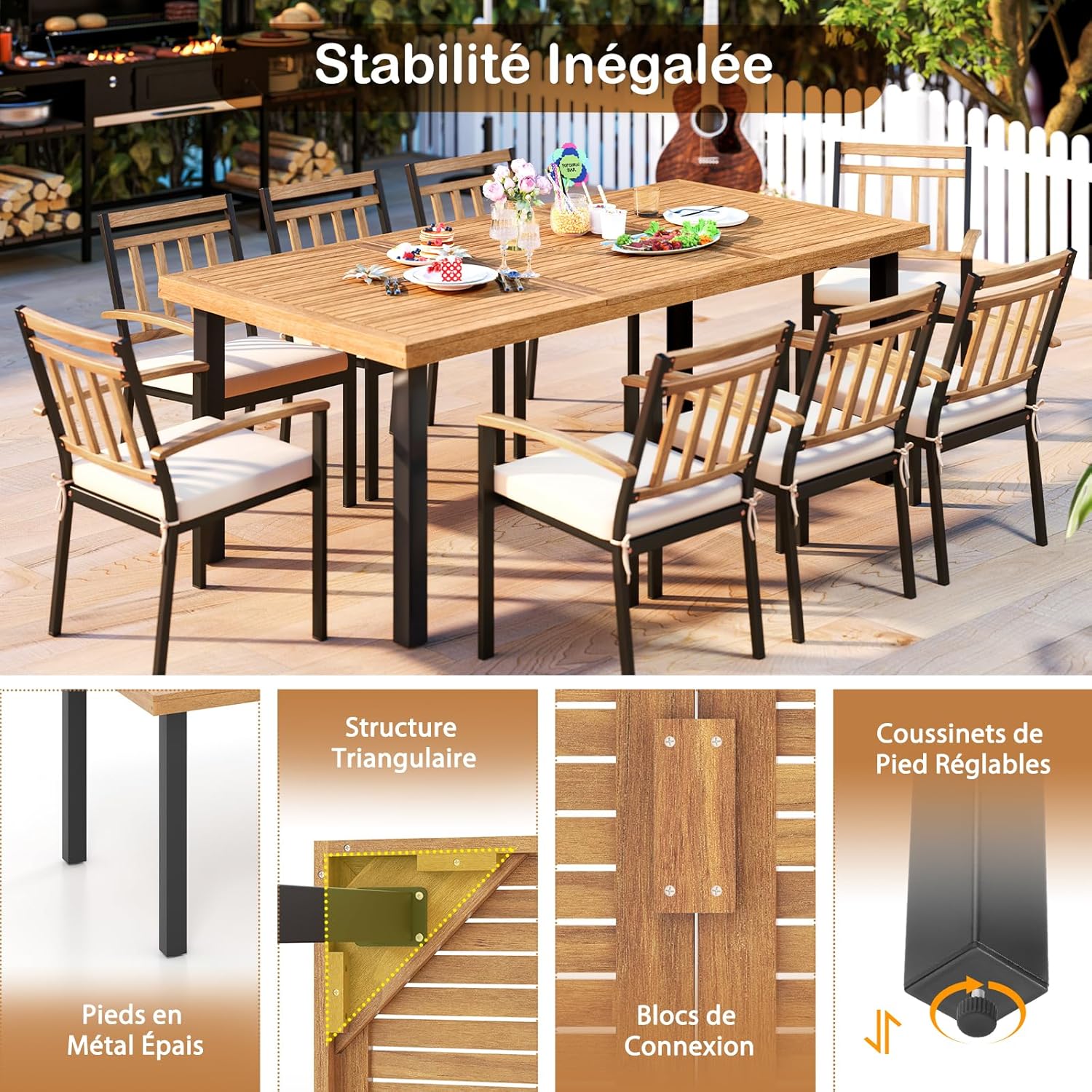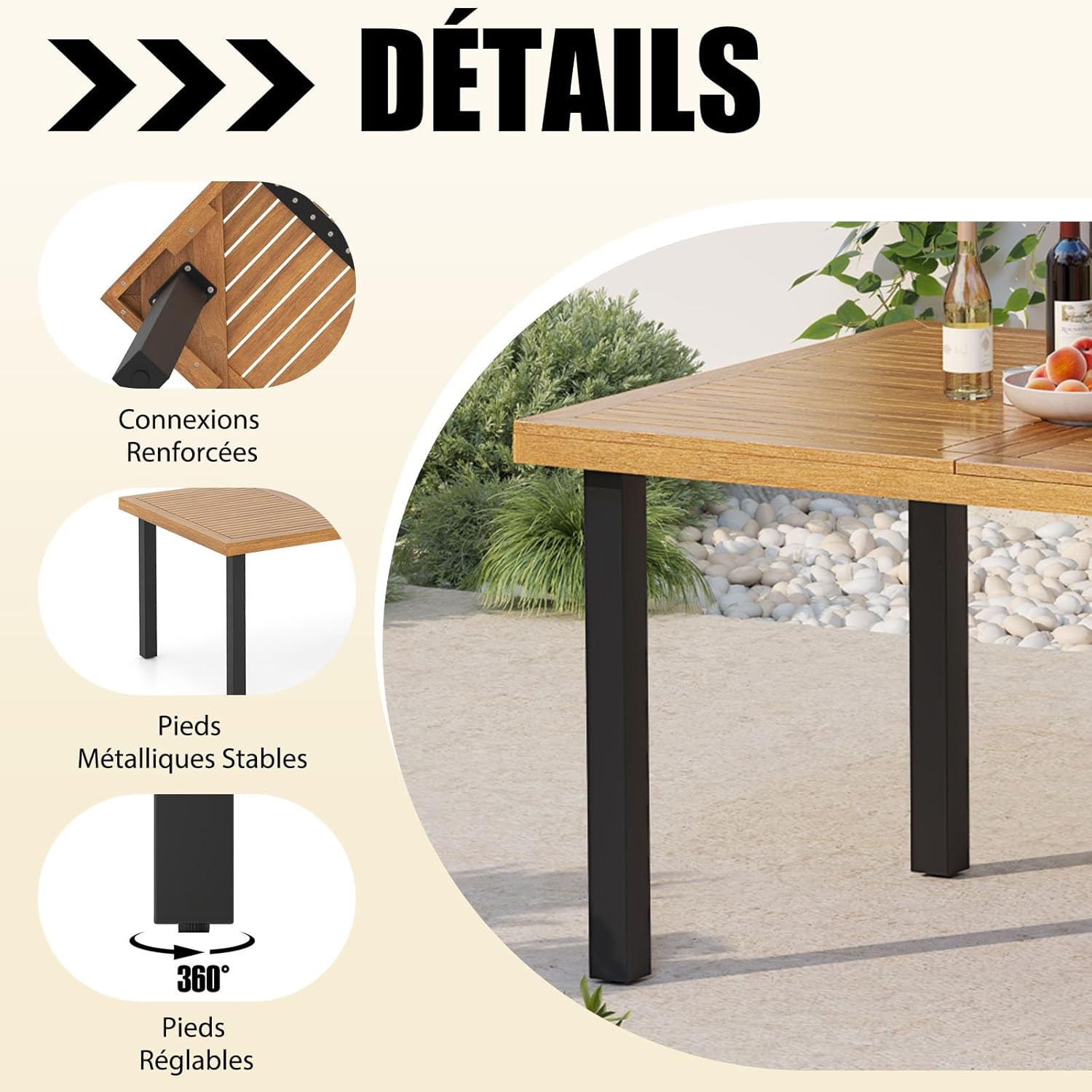 - Plateau en Bois Massif d'Acacia : Le plateau de cette table de salle à manger pour l'extérieur est fabriqué en bois d'acacia de haute qualité, très robuste et résistant à la déformation. Il est également très résistant aux intempéries. De plus, le plateau de la table a une surface lisse et sans éclats, garantissant une expérience de repas sûre et agréable.