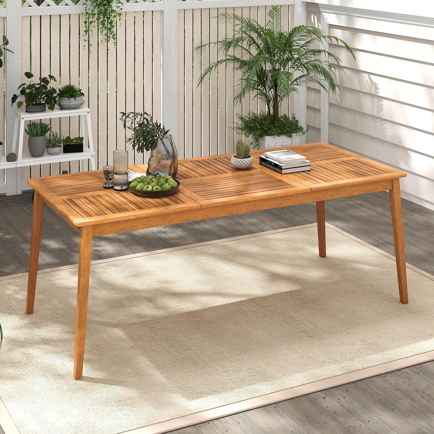 - Entretien Sans Effort : Garder cette table en bois d'acacia en parfait état est facile. L'huile de cire est recommandée pour l'entretien du bois et un simple nettoyage régulier préservera son attrait naturel et sa fonctionnalité pour les années à venir. Pour garantir une durée de vie plus longue, ne la laissez pas à l'extérieur sous la pluie.Notre table de patio rectangulaire chic est fabriquée en bois d'acacia massif. Conçue pour accueillir confortablement 8 convives, elle est parfaite pour les dîners de famille, les brunchs ou les réunions entre amis. Le trou de parasol intégré s'adapte à la plupart des parasols standard pour profiter de l'ombre. Avec sa finition naturelle, elle complète sans effort n'importe quel décor, que ce soit sur la terrasse, dans le jardin ou au bord de la piscine. Facile à entretenir avec un nettoyage régulier et un traitement à l'huile de cire, elle est à la fois élégante et durable.