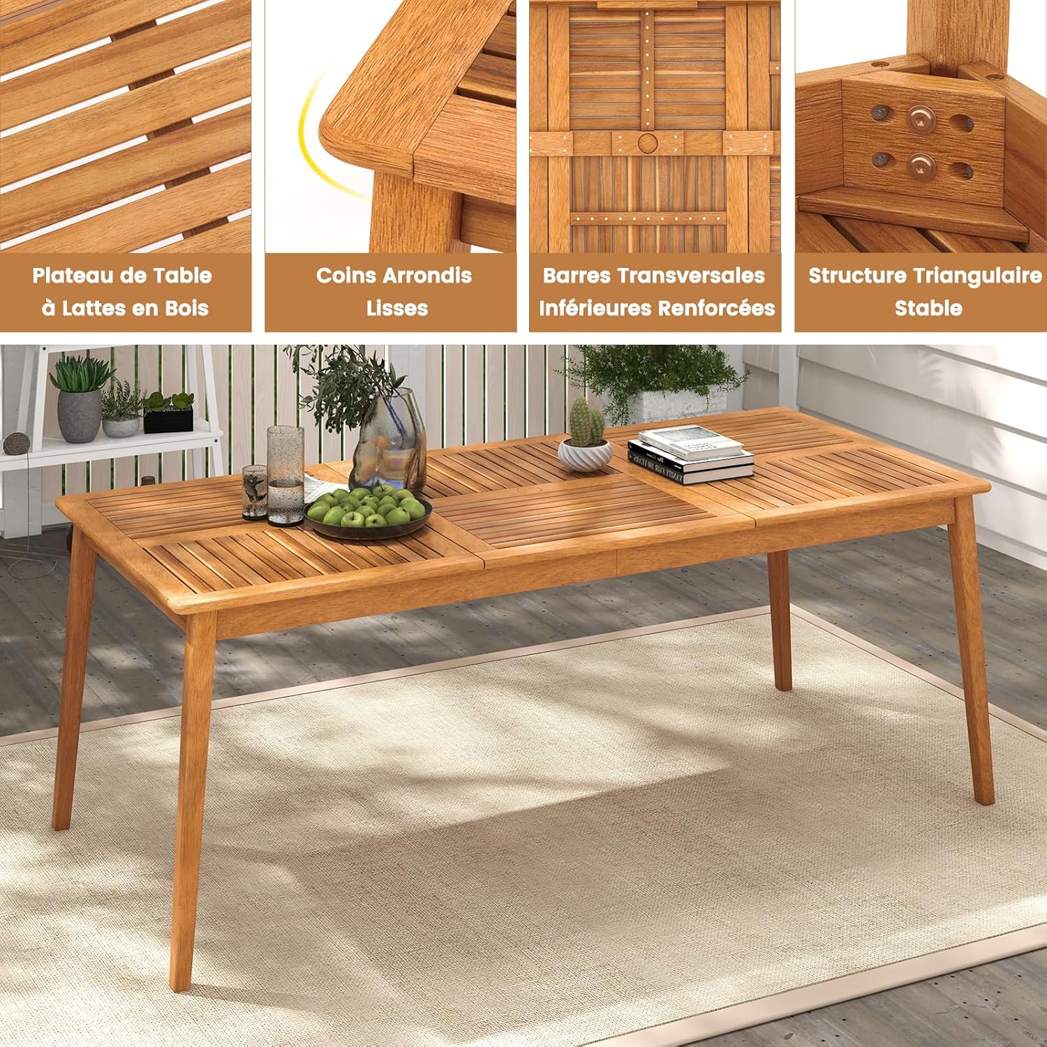- Construction en Bois d’Acacia Massif : Fabriquée à partir de bois d'acacia naturel de qualité supérieure, cette table de patio est non seulement attrayante visuellement, et offre également une grande stabilité et durabilité. Connu pour sa robustesse, l'acacia garantit que cette table peut résister aux éléments extérieurs pendant des années d'utilisation.