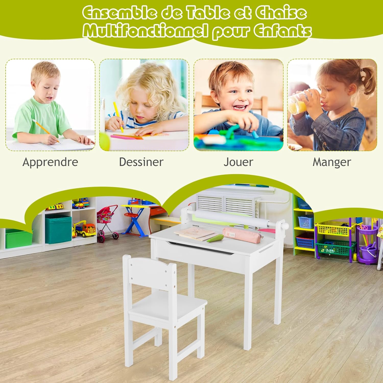 | Libellé | Table enfant avec chaise, table a dessin enfant avec rouleau du papier, bureau d’écriture en bois avec rangement, table polyvalente blanc |