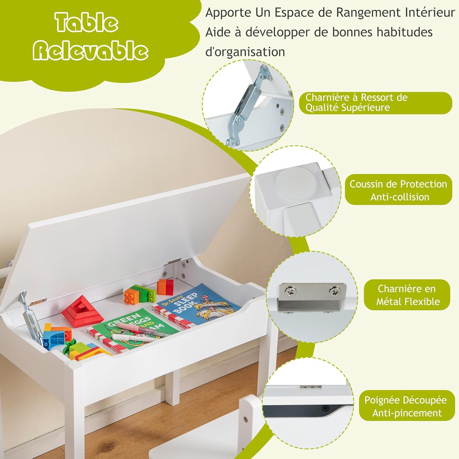 - Espace de Rangement Supplémentaire: La rainure est conçue pour mettre des stylos, tandis que l’espace spacieux sous le plateau rabattable pour ranger des crayons, des jouets, des cahiers, etc. En outre, les charnières de haute qualité gardent le plateau dressé lors de l’ouverture, l’évitant de tomber soudainement.