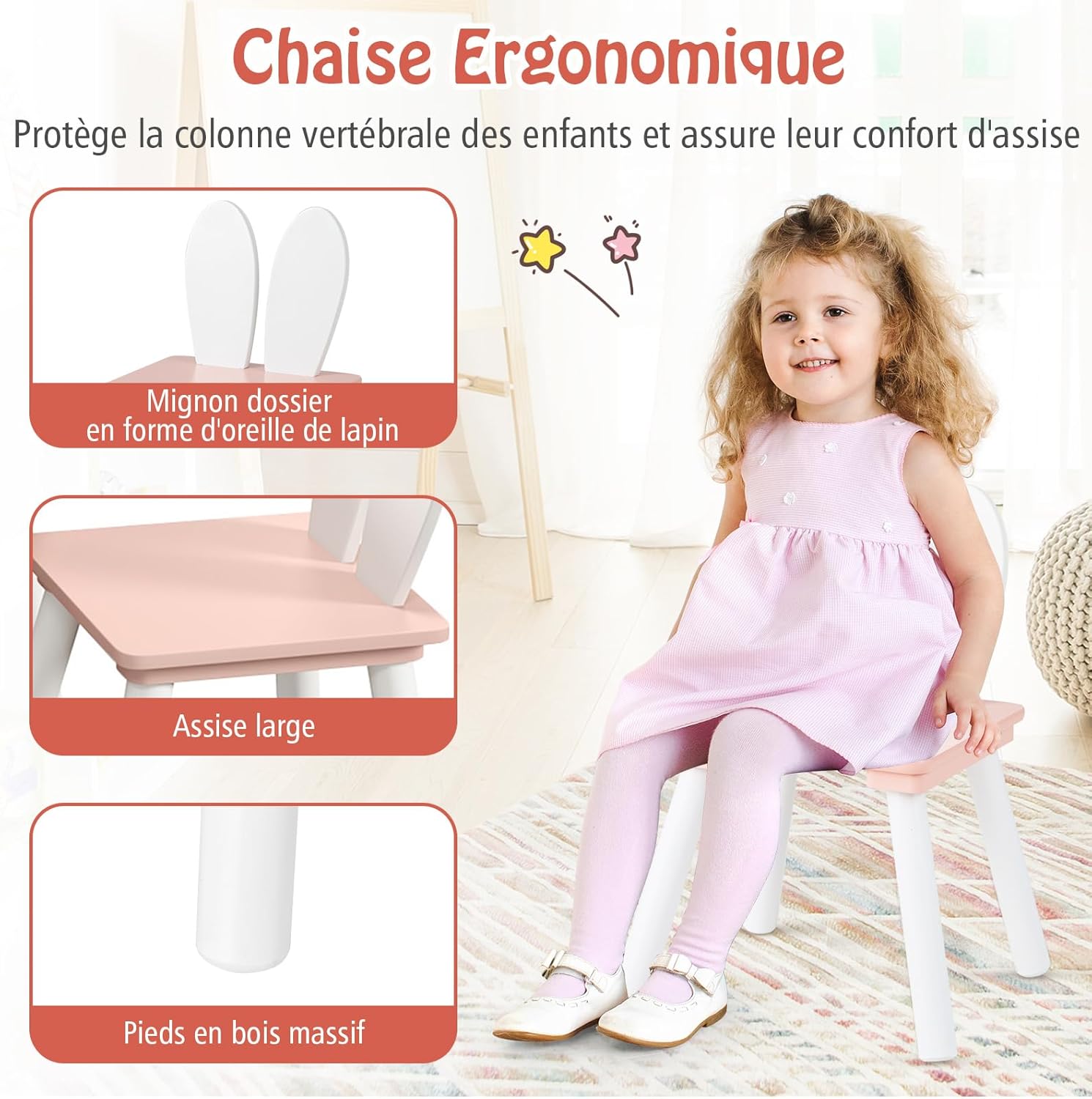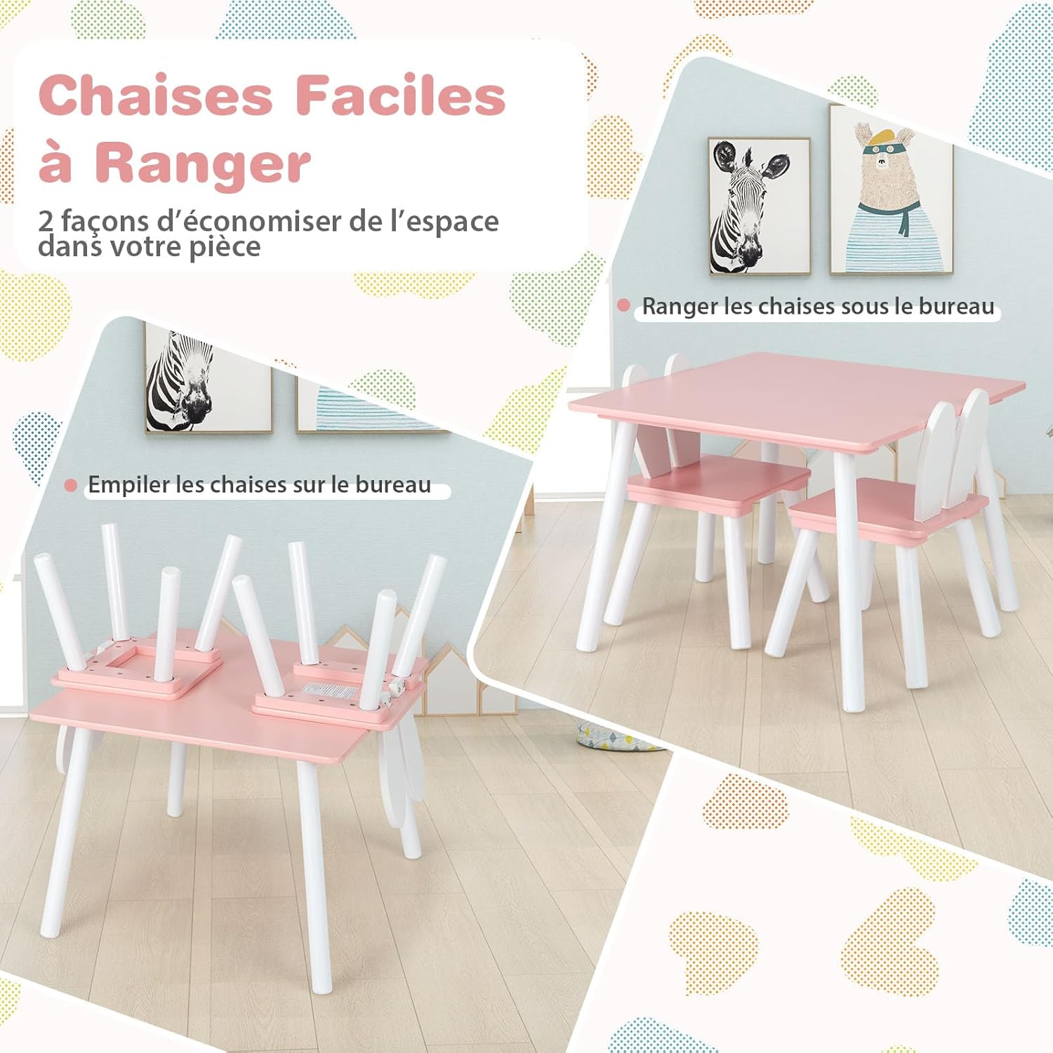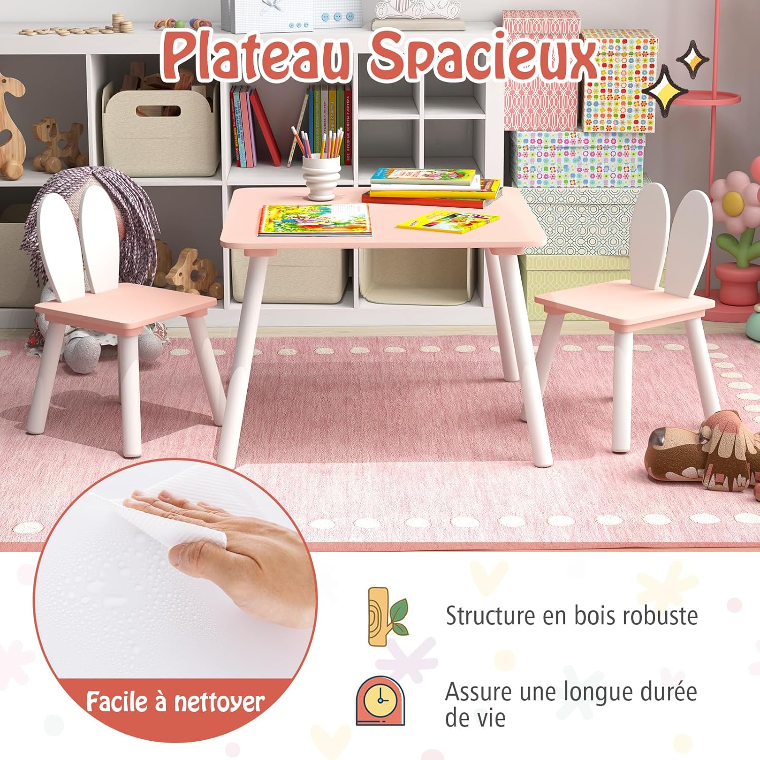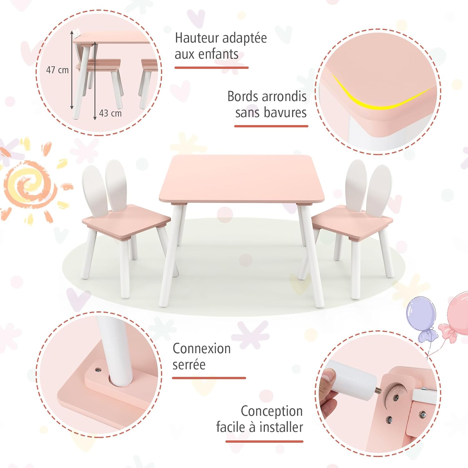 | Libellé | Table enfant avec chaise table d'activités pour tout-petits avec dossier ergonomique en forme d'oreille de lapin coins arrondis 1 table 2 chaises ros |