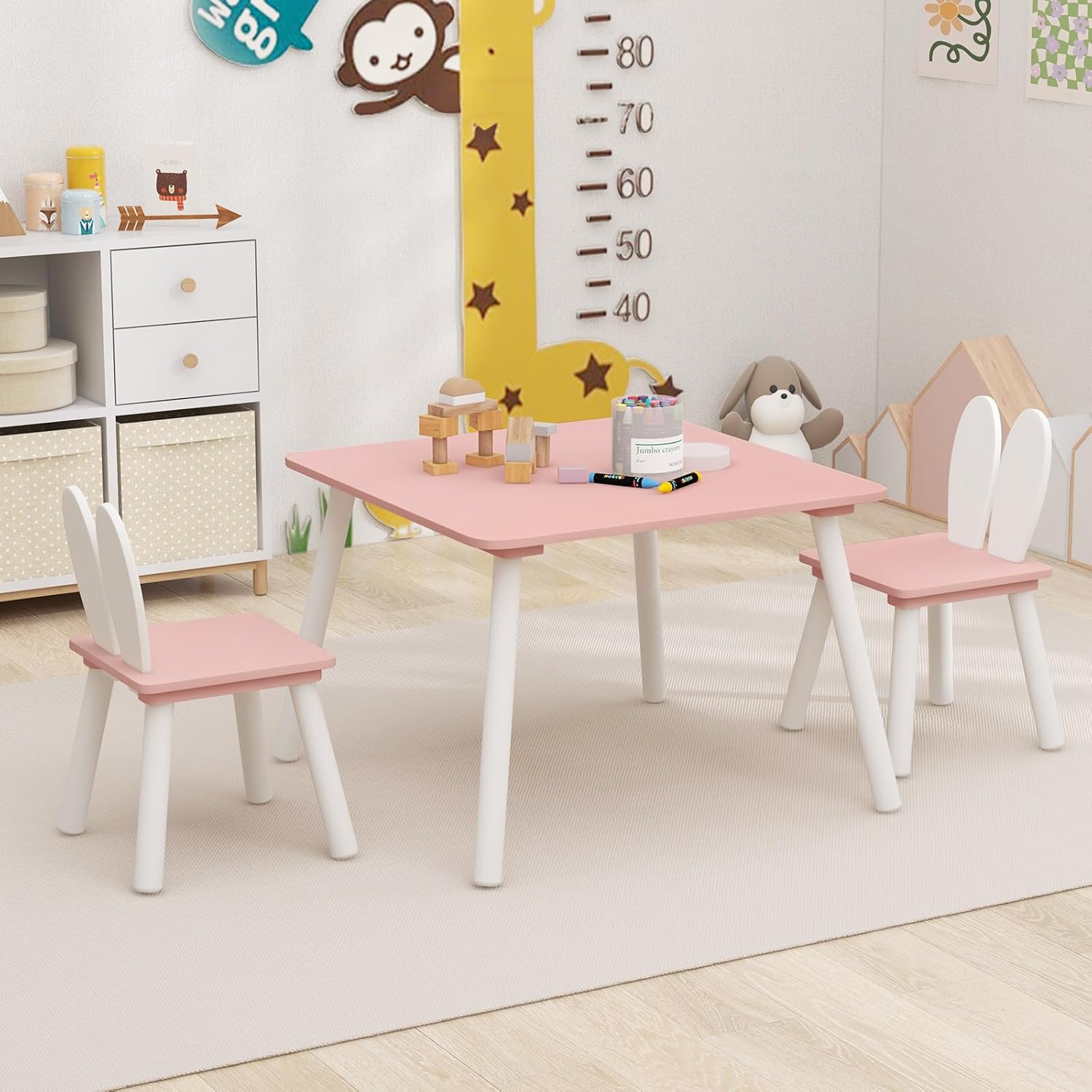 Vous cherchez le bon ensemble de table et de chaise pour enfants pour votre petite princesse ou prince ? Vous pouvez jeter un coup d’œil à notre produit. Il est livré avec une table carrée et deux chaises en forme de jolies oreilles de lapin. Votre enfant peut les utiliser pour manger, dessiner, étudier ou jouer. Fabriqué en MDF et en bois massif, cet ensemble de table et de chaise est sûr, non toxique et respectueux de l’environnement. Dans le même temps, les bords arrondis sans bavures empêchent la peau délicate des enfants d'être blessée. Cet ensemble de meubles pour enfants 3 pièces est un cadeau parfait pour les garçons et les filles. N’hésitez pas à passer votre commande !