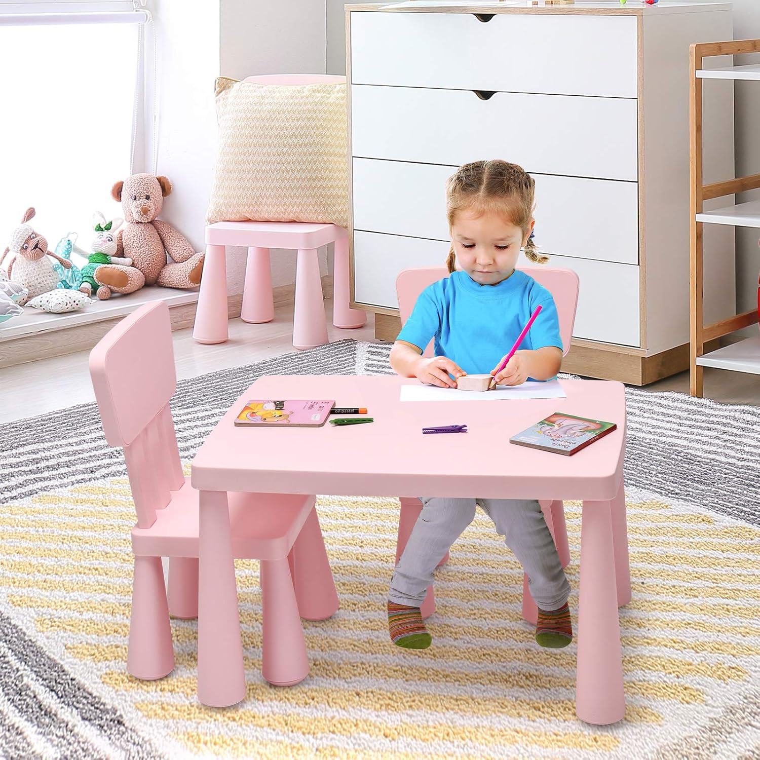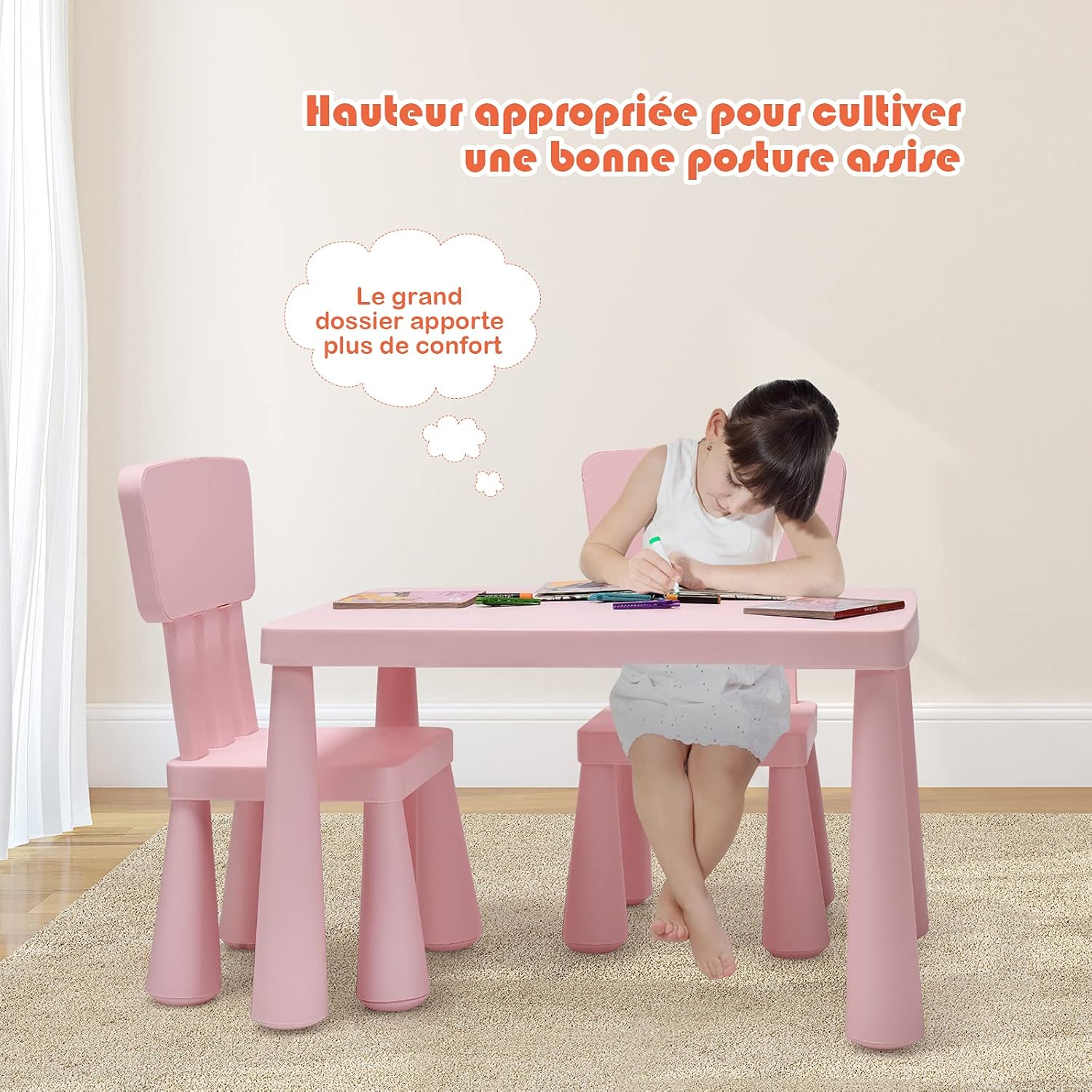 - Conception stable et sûr : Les pieds de notre table enfant et chaises sont suffisament épais dans l’ensemble dont le table et chaque chaise peuvent supporter 50 kg. En ayant des coins arrondis afin d’éviter de se blesser et le dossier élargi permettant à votre enfant de protéger son dos et de garantir sa sécurité lorsque ’il est en position assise.