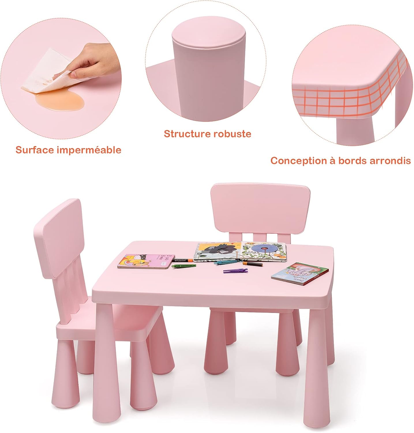 - Facile à nettoyer : L'ensemble table et 2 chaises en polypropylene présente une surface brillante, lisse et une bonne résistance à l'eau. Vous pouvez simplement le nettoyer avec un chiffon, ce qui vous permet d'économiser du temps et de l'énergie et de permettre à votre enfant de grandir dans un environnement propre.