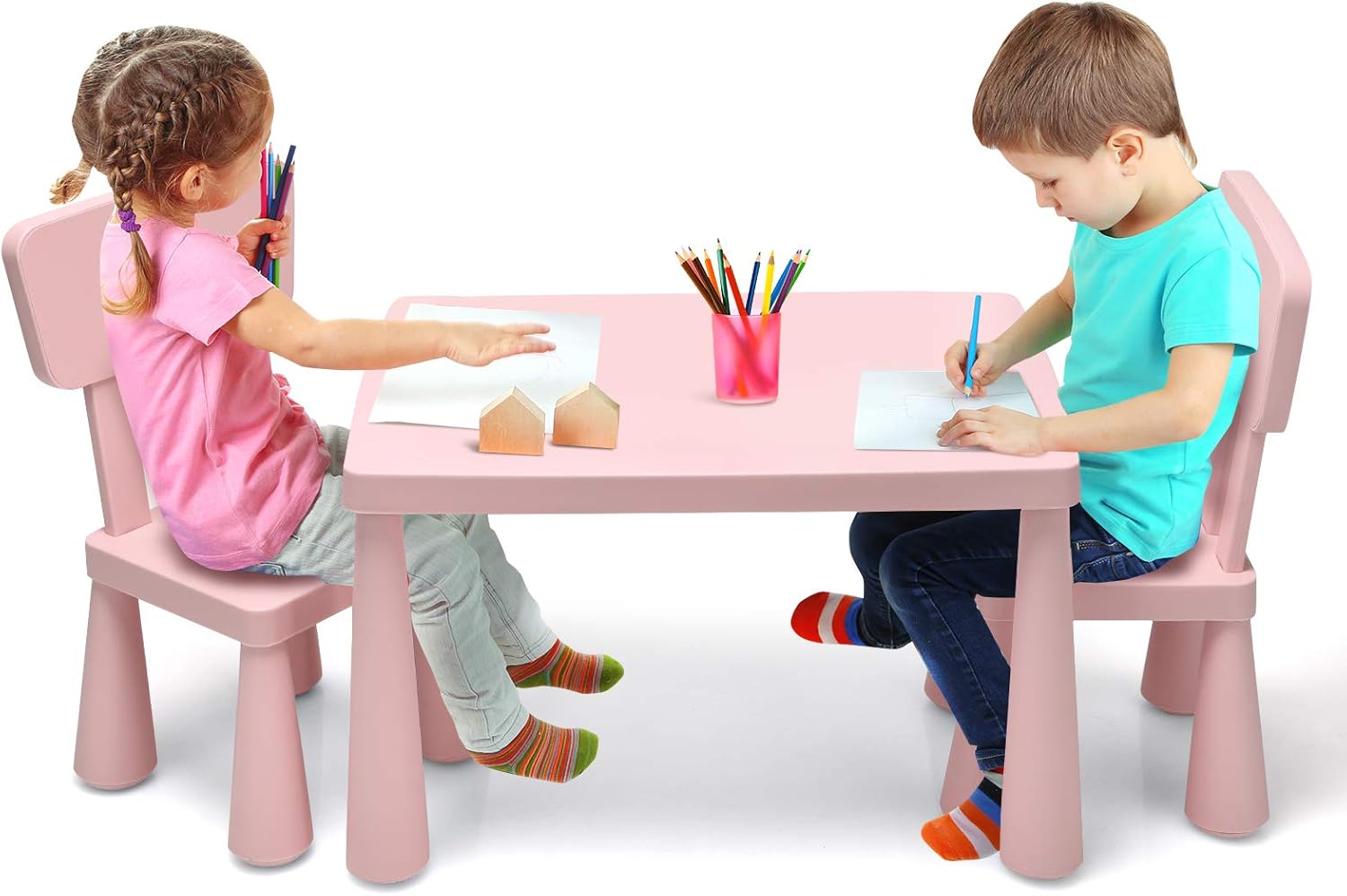 La base parfaite pour le plaisir et l'apprentissage, l'ensemble table et 2 chaises pour enfants est composé d'un polypropylène lisse qui le rend extrêmement durable et facile à nettoyer. Que votre enfant l'utilise pour des projets artistiques, des réceptions, une collation ou des devoirs. La belle finition de la table complétera la chambre et la salle de jeux.