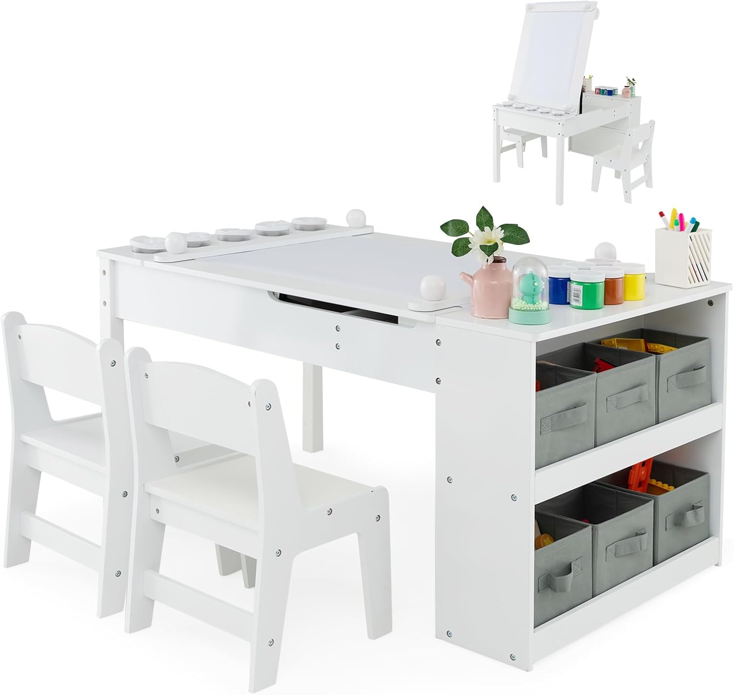 Table enfant avec chaises, table d'activités avec plateau relevable, 6 bacs de rangement, 5 pots à peintu