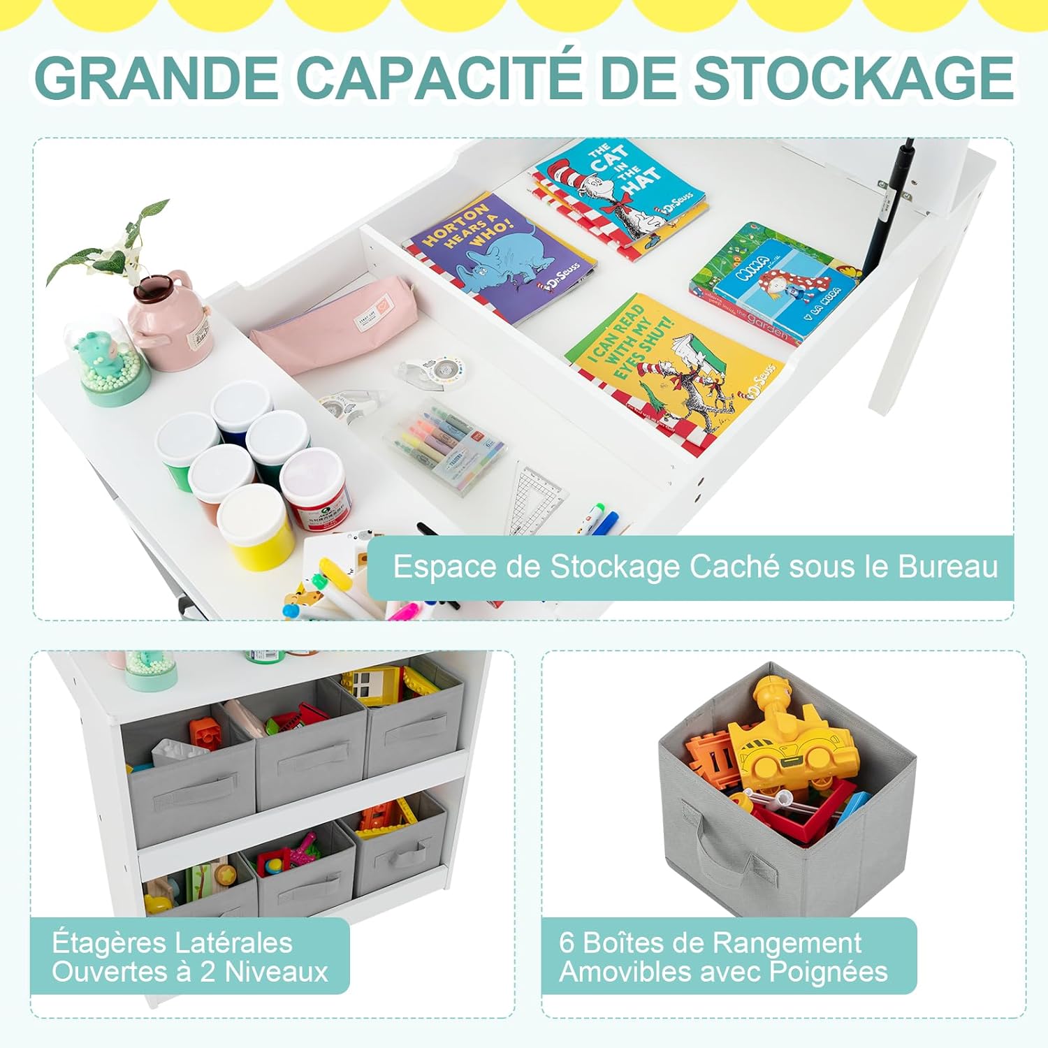 - Espace de stockage massif : Il y a un espace de stockage spacieux sous le bureau pour les fournitures artistiques des enfants ou d'autres articles. De plus, la table polyvalente est conçue avec des étagères ouvertes à 2 niveaux et livrée avec 6 boîtes de rangement en tissu amovibles avec poignées, permettant aux enfants de classer, stocker et récupérer facilement leurs propres objets.