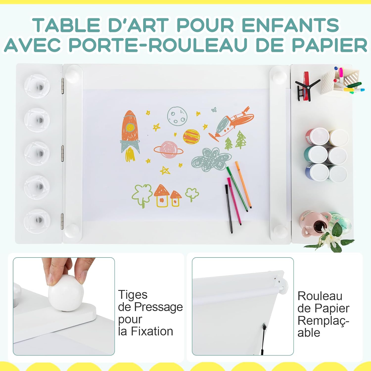 - Conception tout-en-un : Cette table d'art avec plateau rabattable peut servir de chevalet d'art lorsque le plateau est soulevé. Une fois abaissé, il devient un bureau normal pour peindre, écrire, lire, jouer. De plus, avec le porte-rouleau de papier, la tige de fixation pour le papier, le rouleau de papier de rechange de 10 m de long et 5 pots à peinture, cet ensemble table et chaises peut être un centre d’activités parfait pour les enfants.