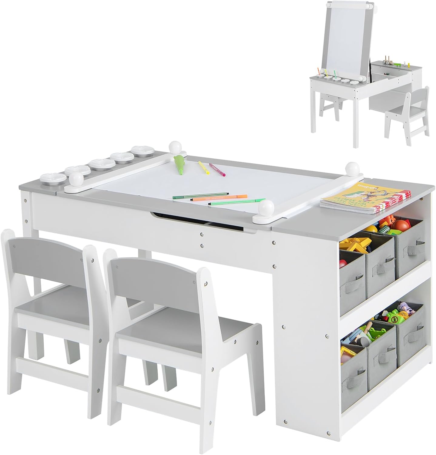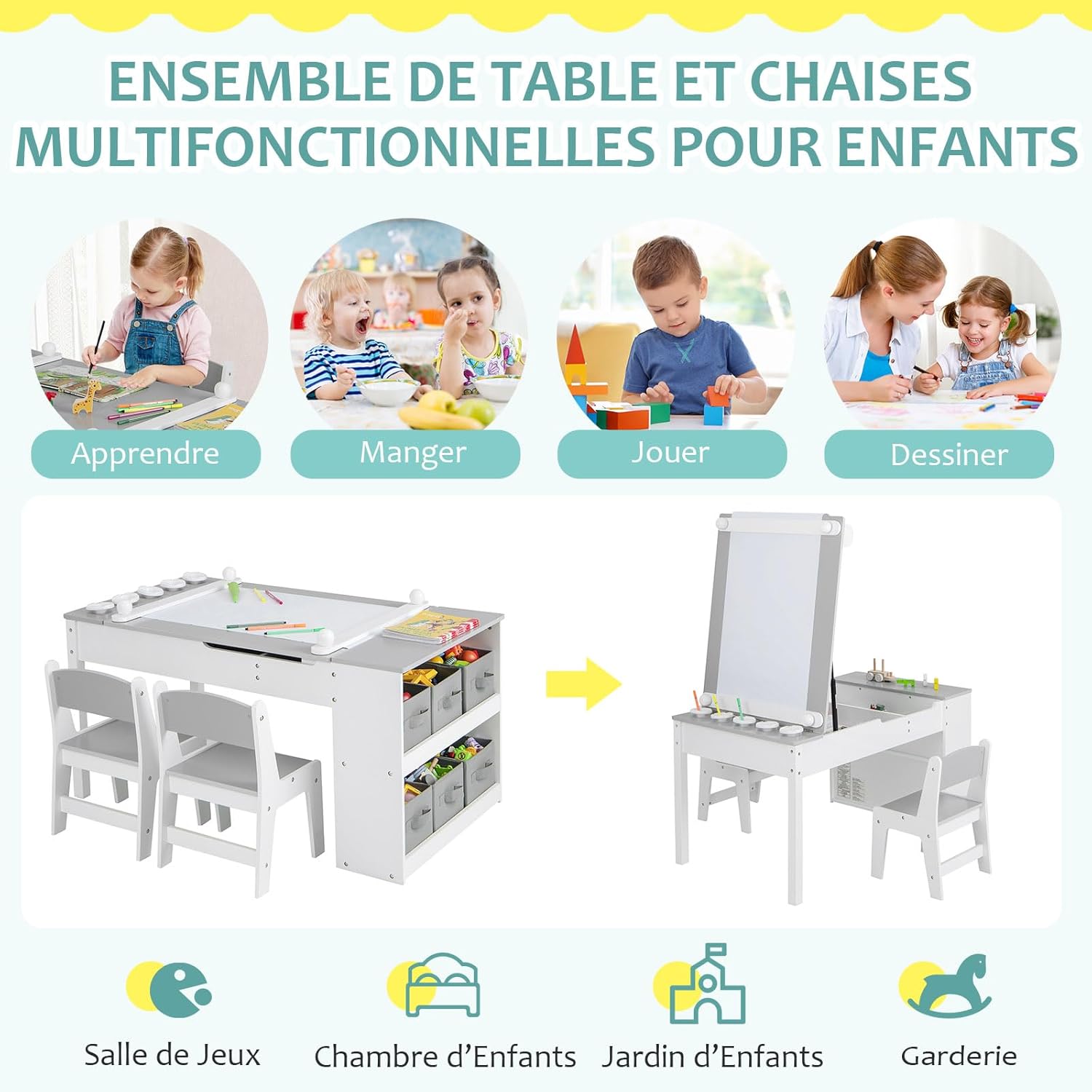 Table enfant avec chaises, table d'activités avec plateau relevable, 6 bacs de rangement, 5 pots à peintu