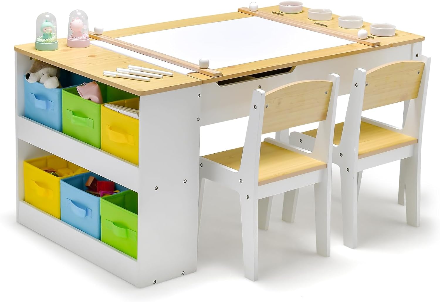Table enfant avec chaises, table d'activités avec plateau relevable, 6 bacs de rangement, 5 pots à peintu