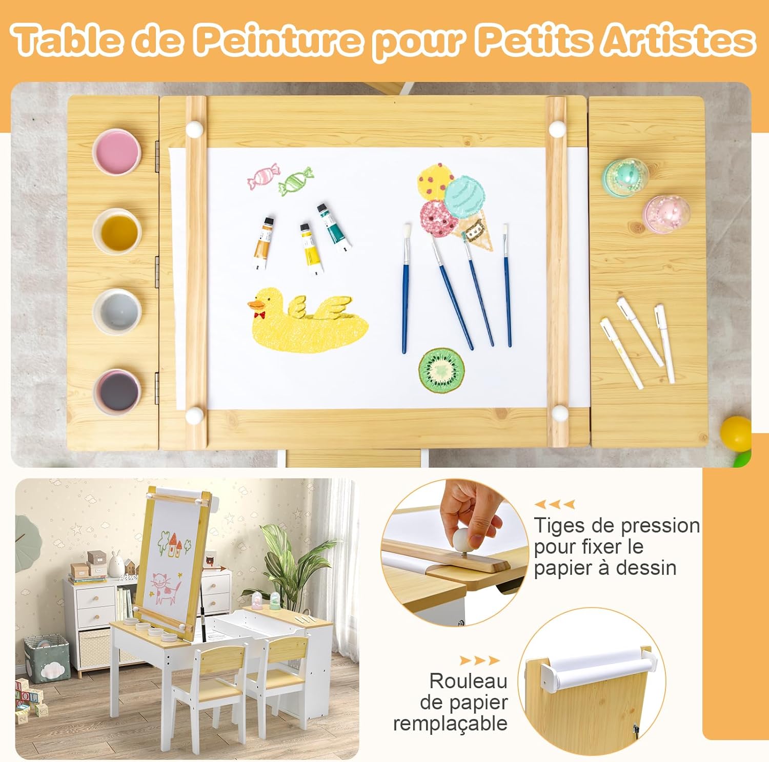 - Conception tout-en-un: Cette table d'art avec plateau rabattable peut servir de chevalet d'art lorsque le plateau est soulevé. Une fois abaissé, il devient un bureau normal pour peindre, écrire, lire, jouer. De plus, avec le porte-rouleau de papier, la tige de fixation pour le papier, le rouleau de papier de rechange de 10 m de long et 5 pots à peinture, cet ensemble table et chaises peut être un centre d’activités parfait pour les enfants.