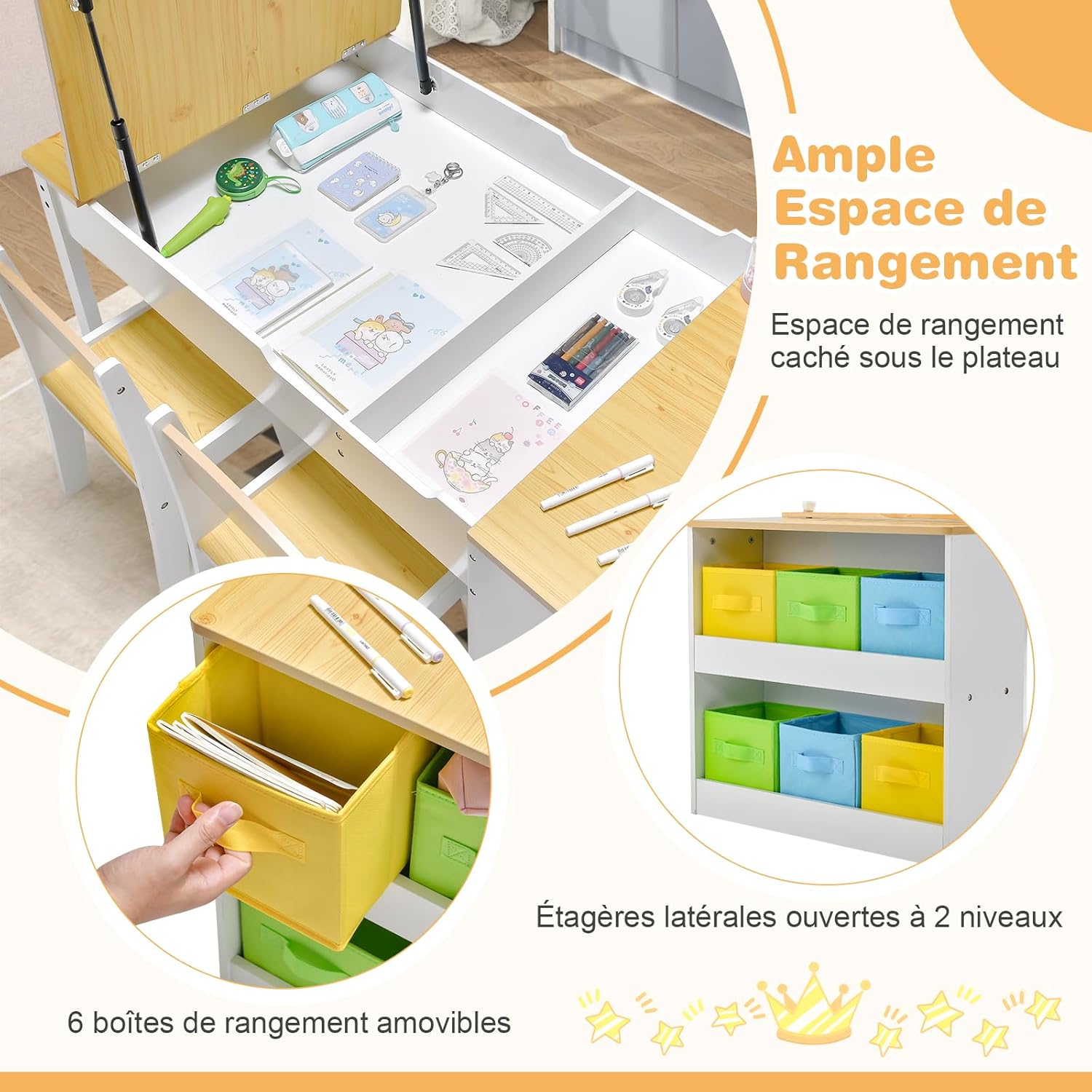 - Espace de stockage massif : Il y a un espace de stockage spacieux sous le bureau pour les fournitures artistiques des enfants ou d'autres articles. De plus, la table polyvalente est conçue avec des étagères ouvertes à 2 niveaux et livrée avec 6 boîtes de rangement en tissu amovibles avec poignées, permettant aux enfants de classer, stocker et récupérer facilement leurs propres objets.