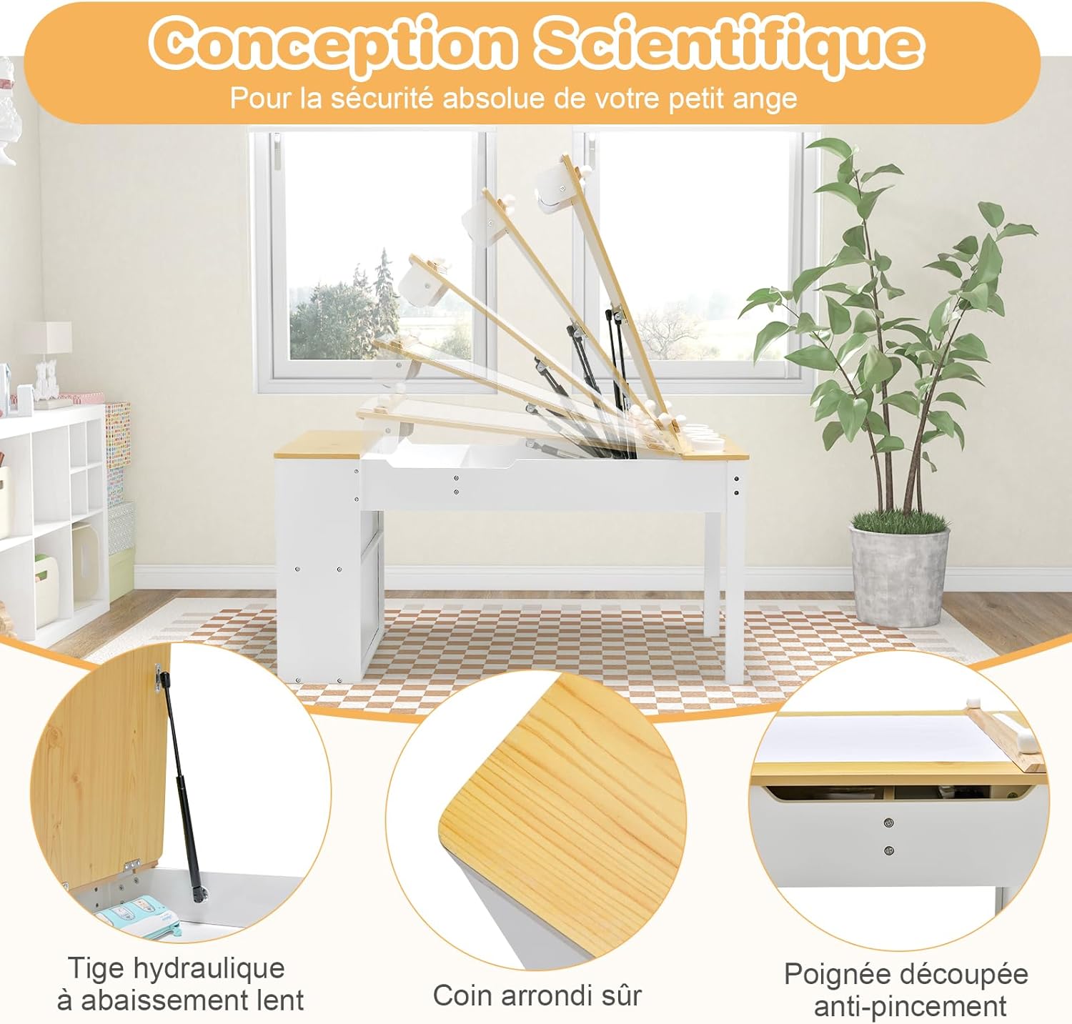- Conception sûre et réfléchie : Doté de poignées découpées anti-pincement et de tiges pneumatiques à chute lente, le plateau peut être ouvert et fermé en toute sécurité. De plus, cette table d'activités pour enfants adopte des coins arrondis et des bords lisses pour une sécurité accrue. Capacité de poids du bureau : 91 kg ; Capacité de poids de chaque chaise : 75 kg.