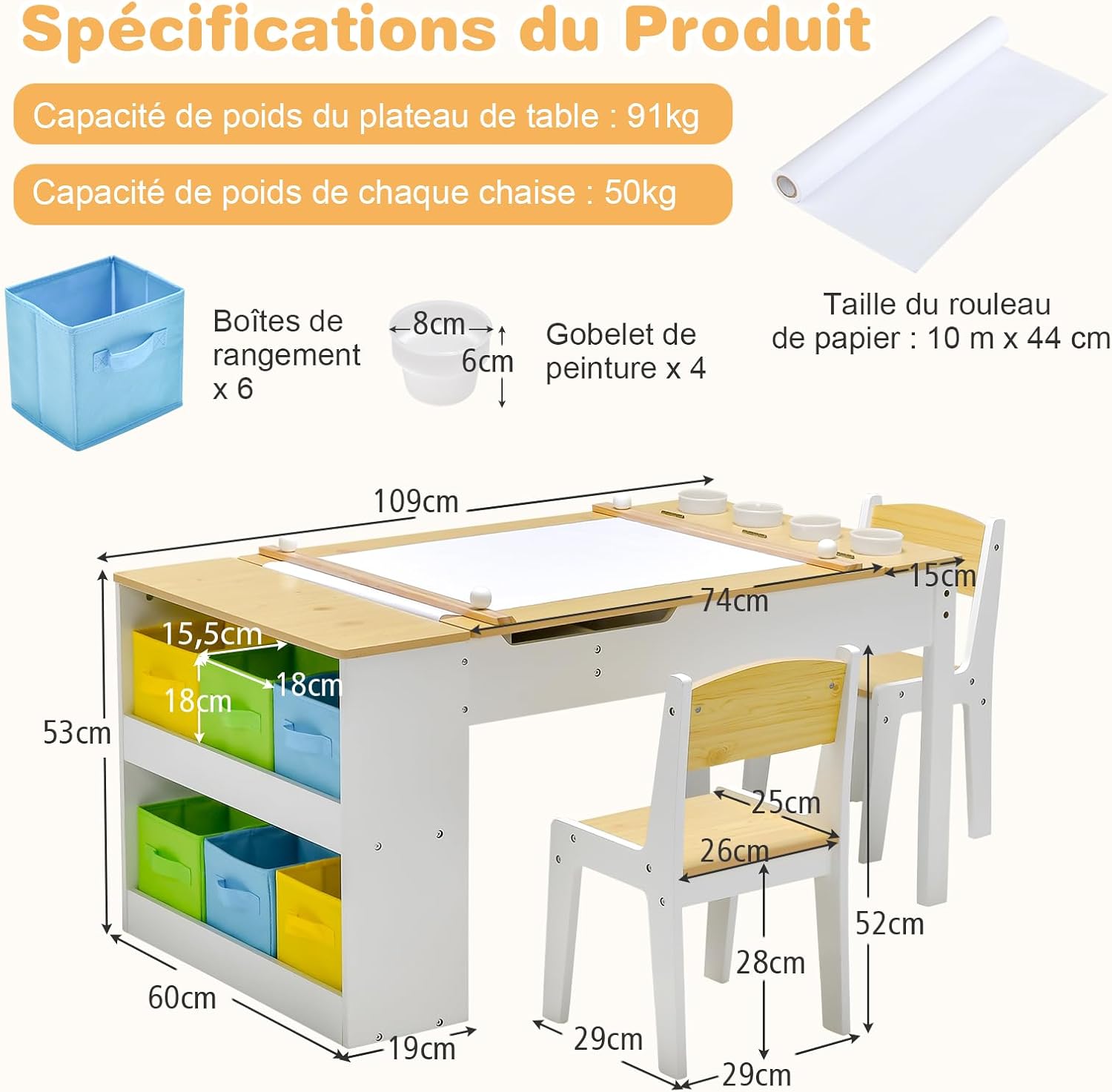 | Libellé | Table enfant avec chaises, table d'activités avec plateau relevable, 6 bacs de rangement, 5 pots à peinture, 1 rouleau de papier, table d’art naturel |