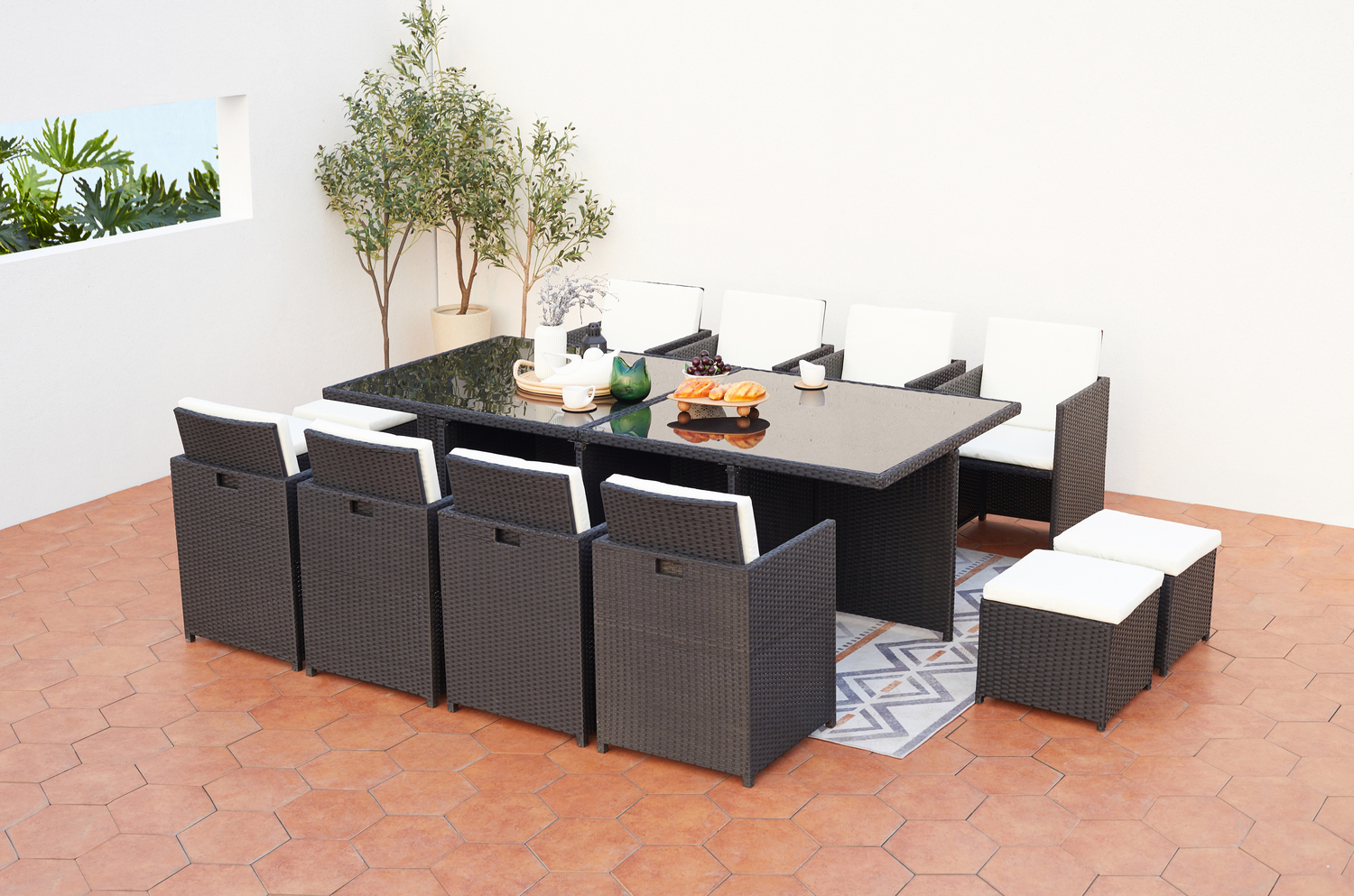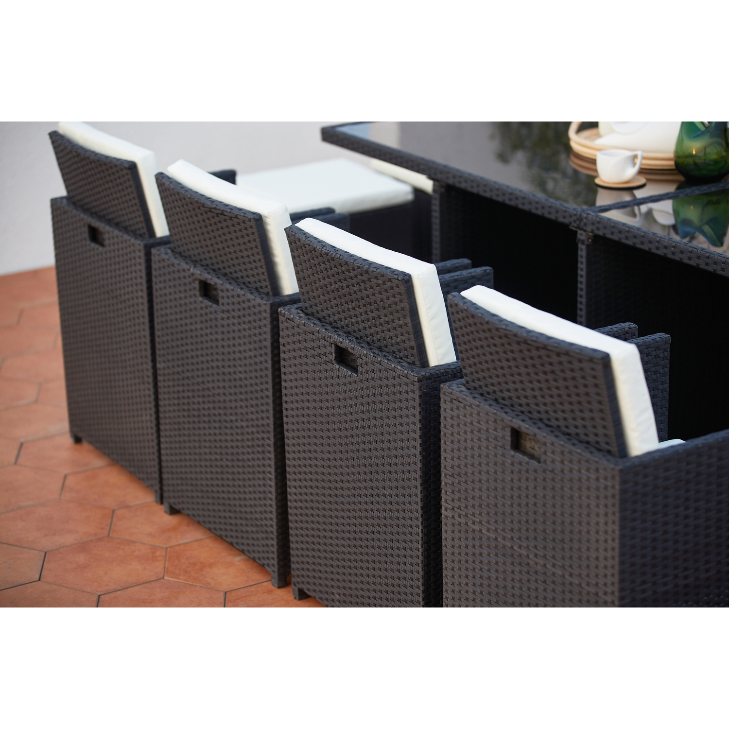 Table et chaises 12 places encastrables résine noir-blanc MONACO