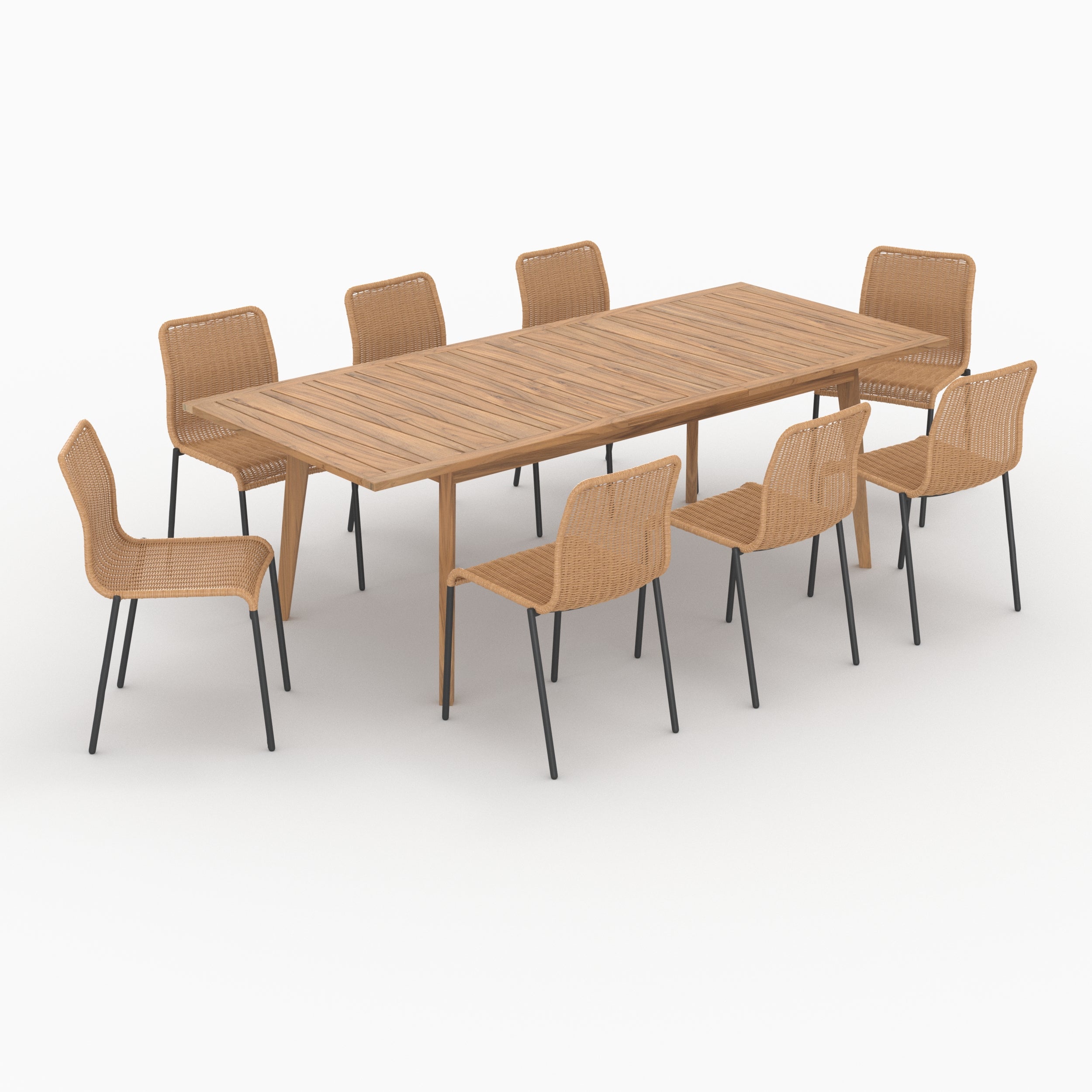 Découvrez l'ensemble table et chaises de jardin Tunga pour 8 personnes, en bois de teck et résine tressée naturelle. Ce set élégant et pratique est parfait pour sublimer votre espace extérieur.
