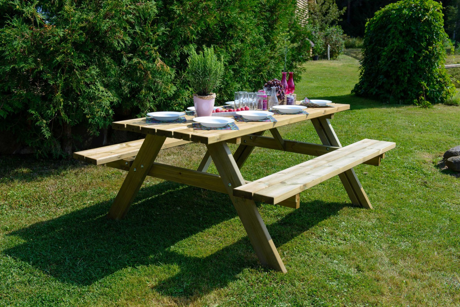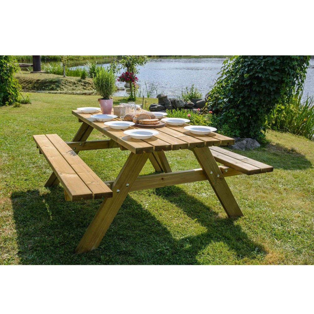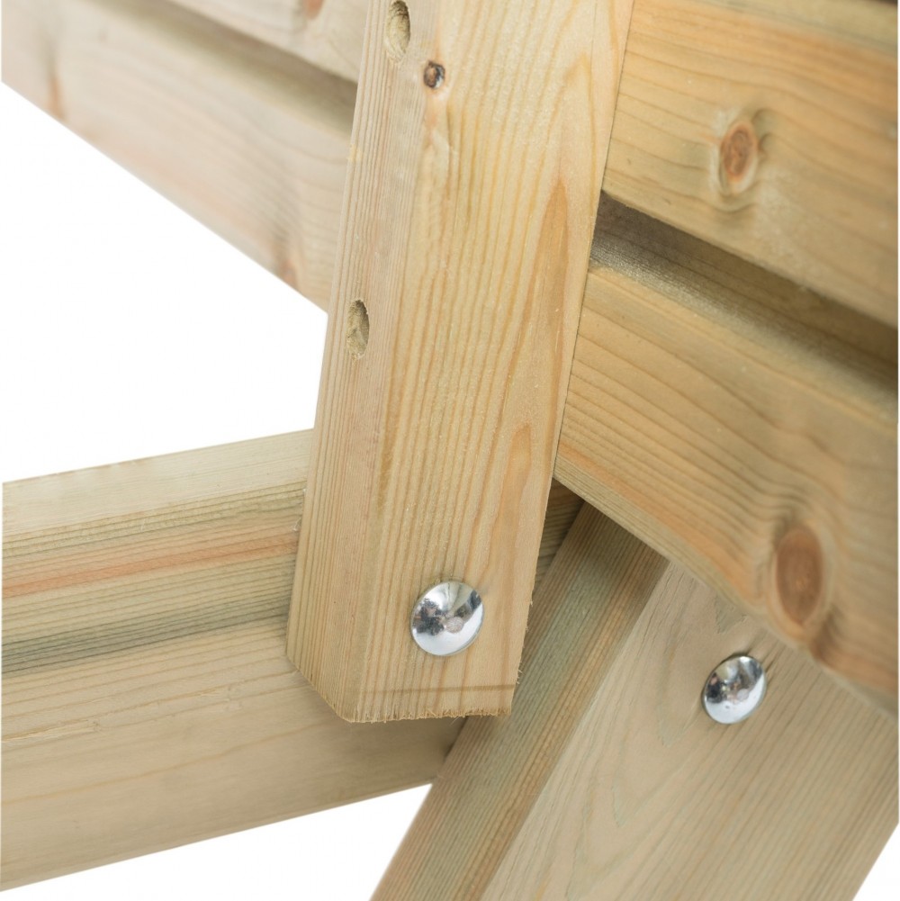 | Libellé | table forestière en pin du nord de l'europe fsc traité en autoclave teinté brun dim 177x153xh76 cm, épaisseur plateau 42 mm, bancs pliables. à monter |