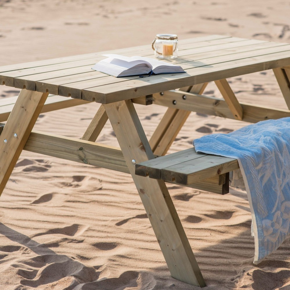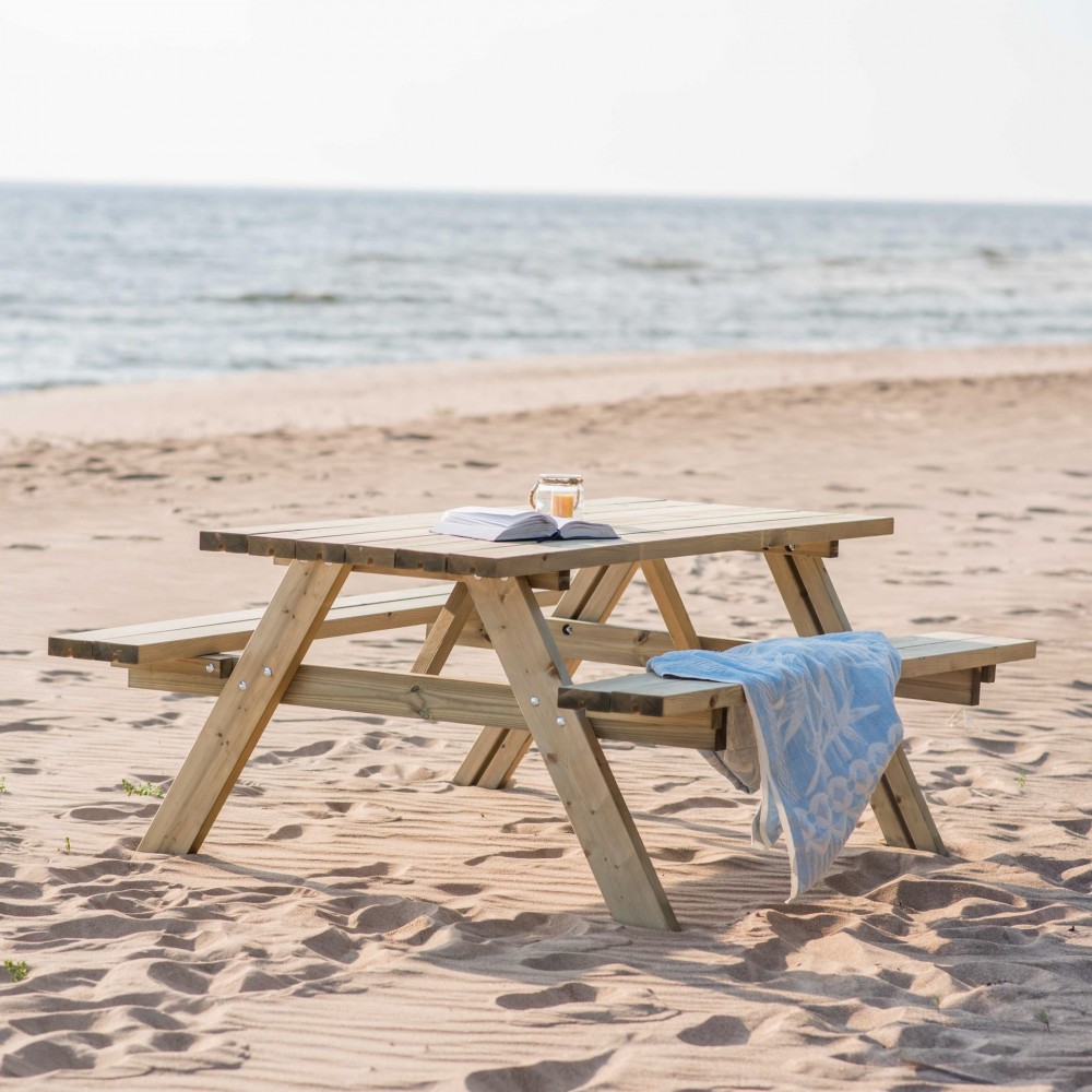 Table forestière en pin du Nord de l'Europe FSC traité en autoclave teinté brun dim 177x154xh74 cm, épaisseur plateau 42 mm, bancs pliables. Origine Lettonie.