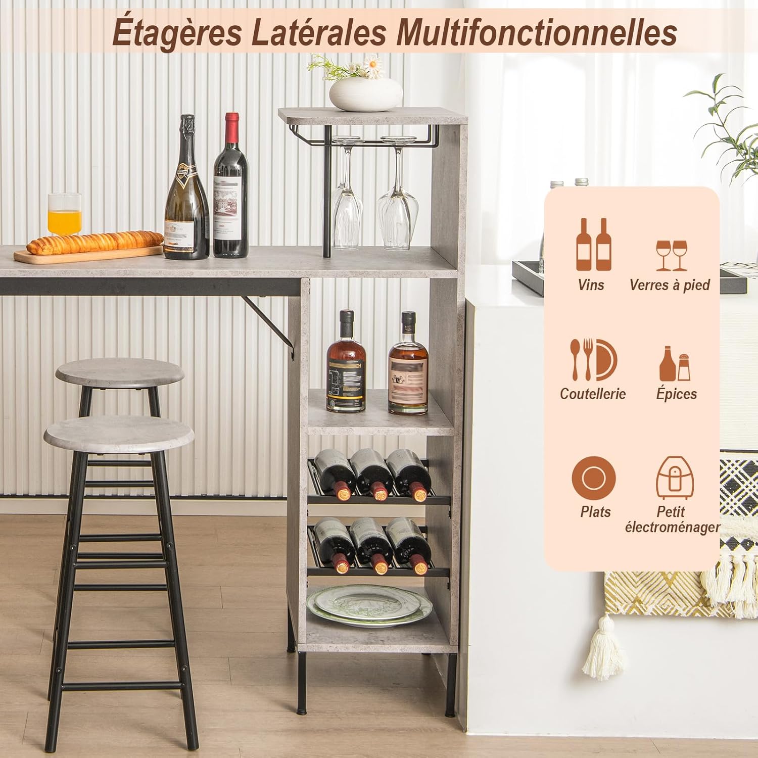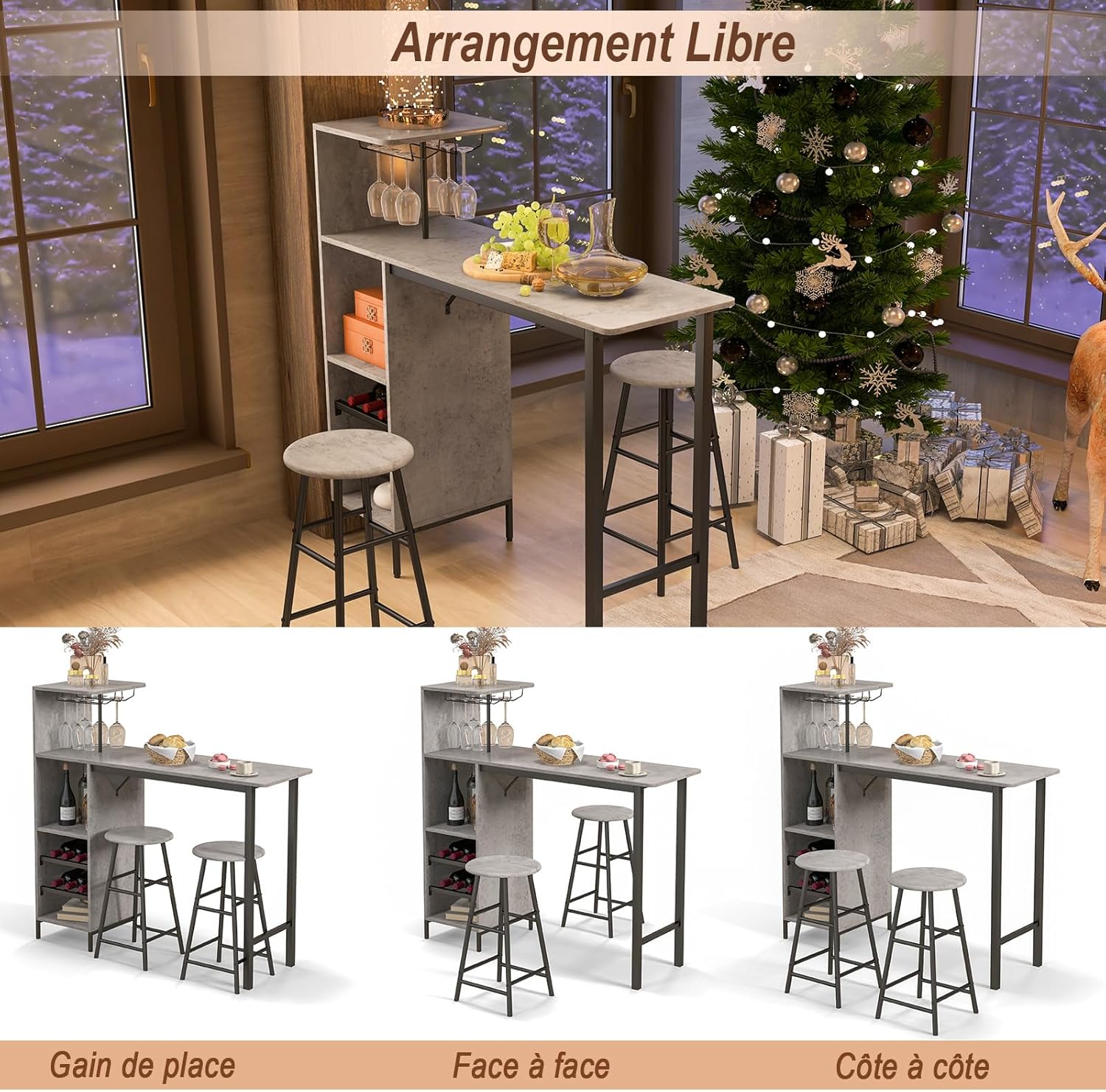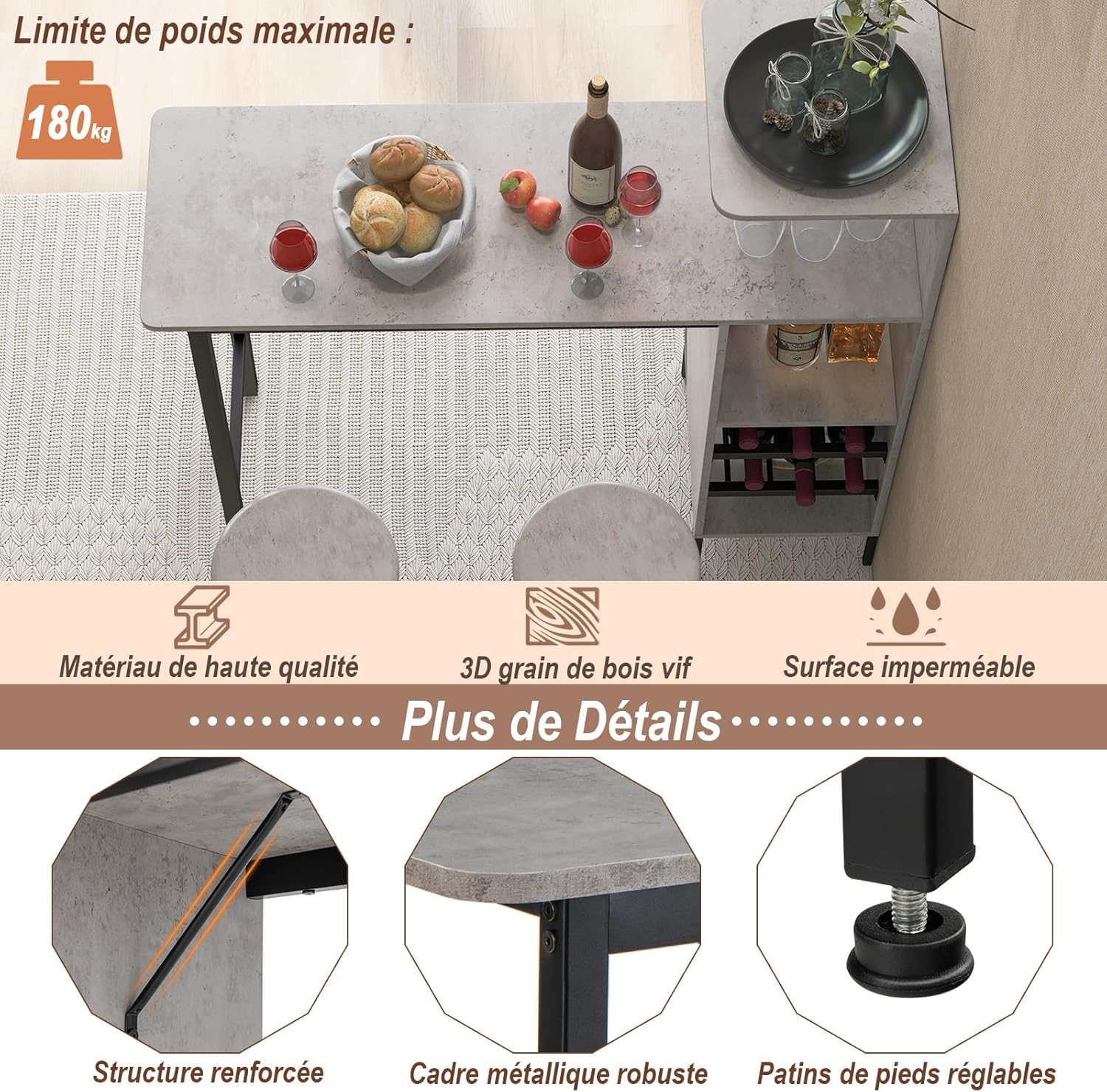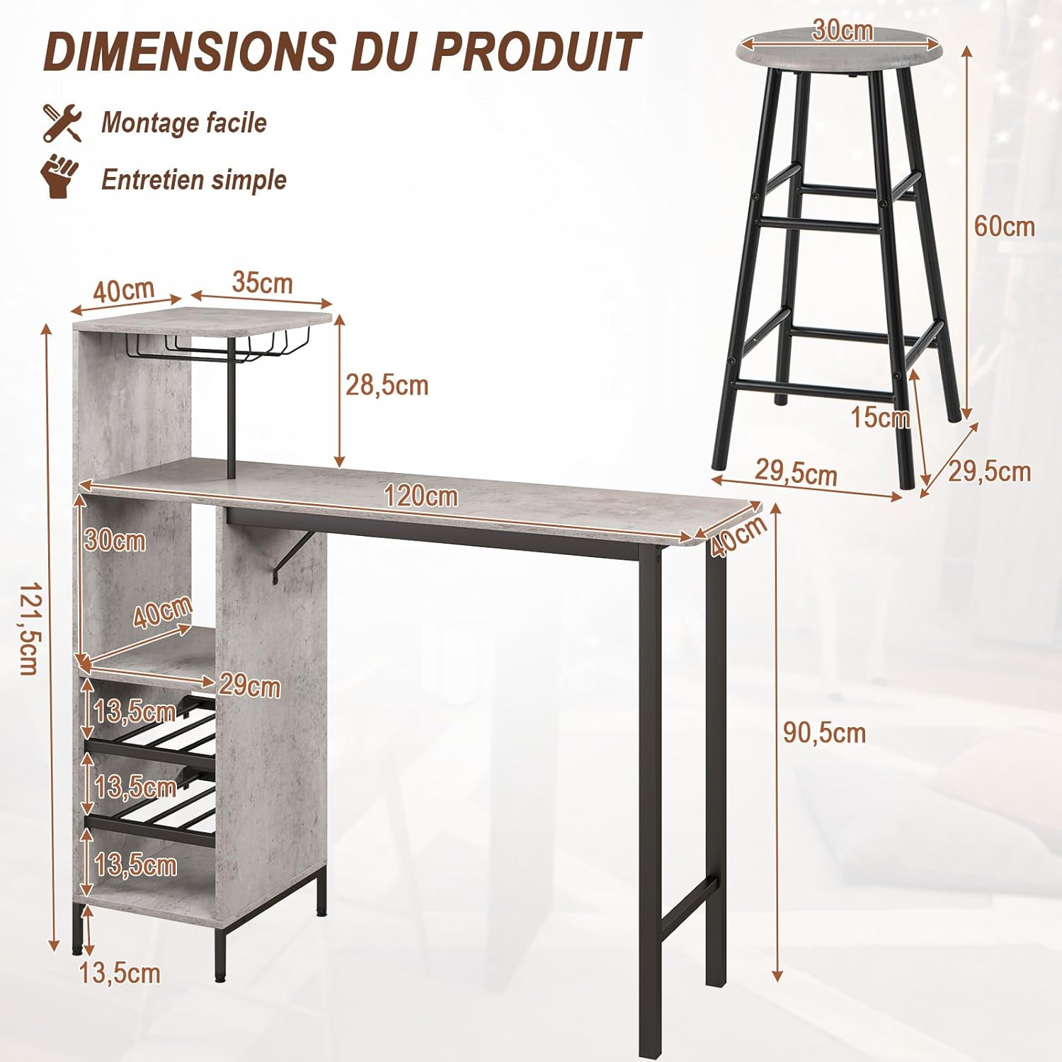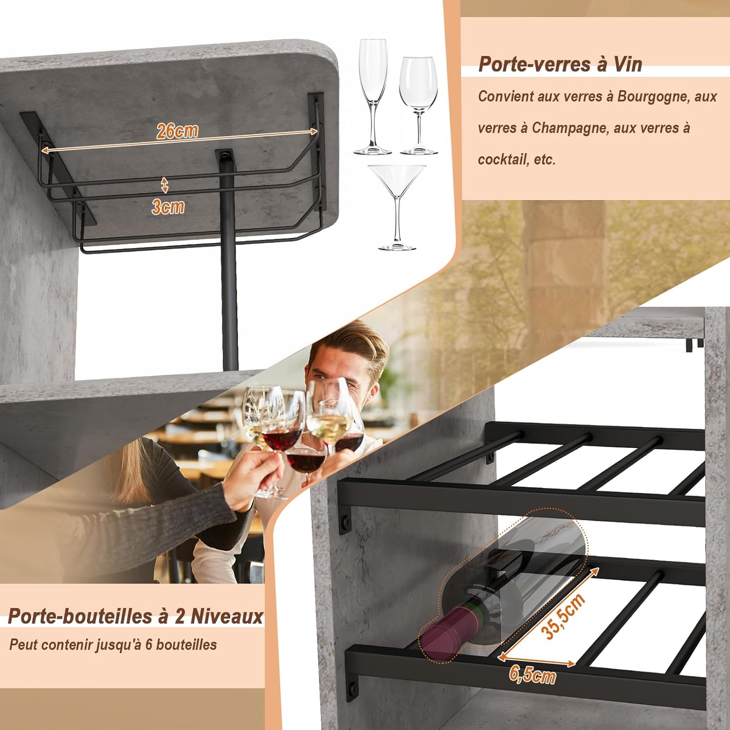 Libellé Table haute avec tabouret, mange debout avec porte-verre, porte-bouteille, étagères, petite table bar industrielle pour cuisine bistro gris