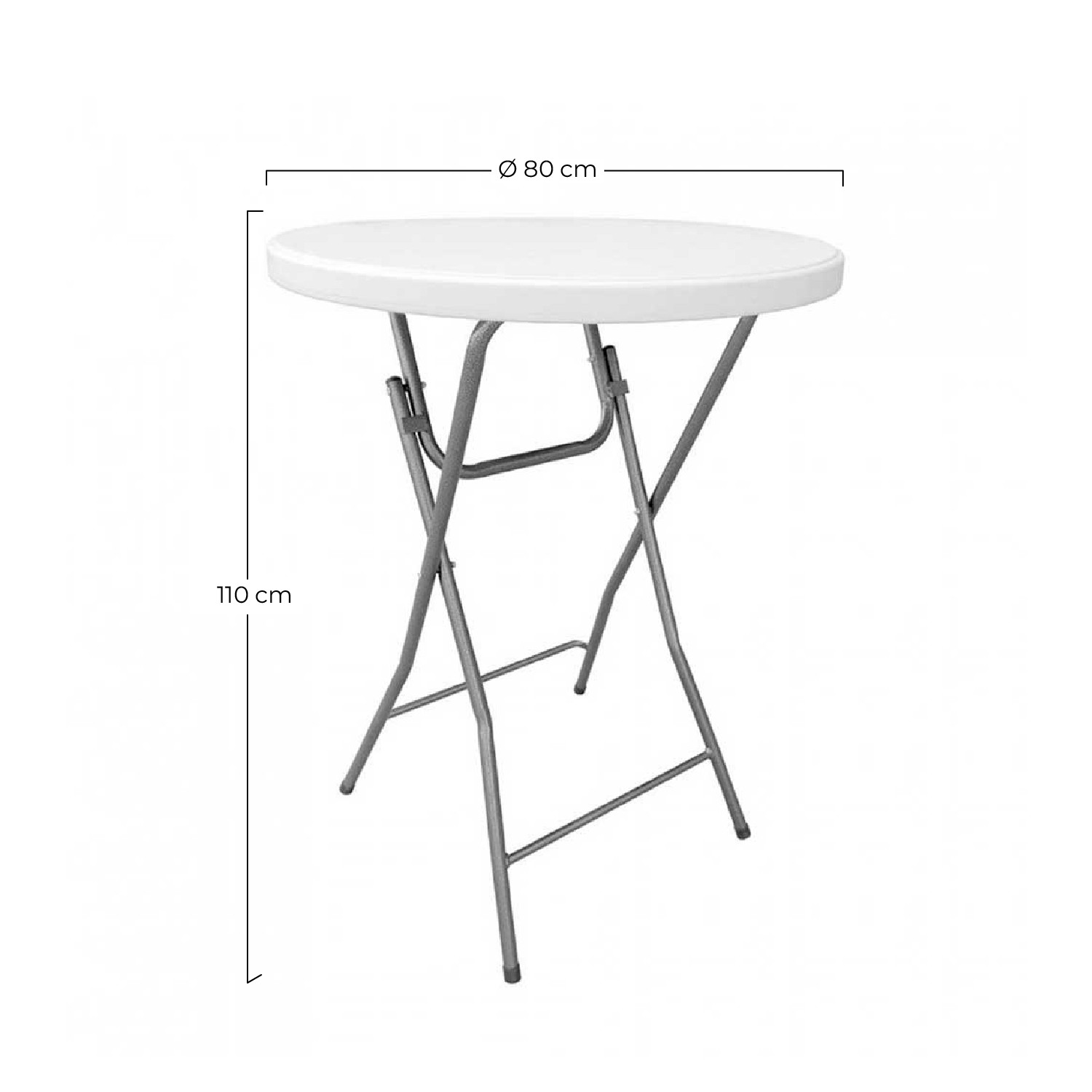 Cette table de restauration est pliable, son transport et son rangement sont donc très pratiques et simples. Il dispose d'un système de verrouillage de sécurité, d'une planche de Ø80 cm de diamètre et d'une structure en acier pour offrir une plus grande stabilité partout où vous le placez. Table en polyéthylène, un matériau très facile à nettoyer même avec un chiffon humide. Capacité de 2 à 4 personnes. Vous pourrez y déposer des verres, des canapés ou des couverts en toute sécurité.