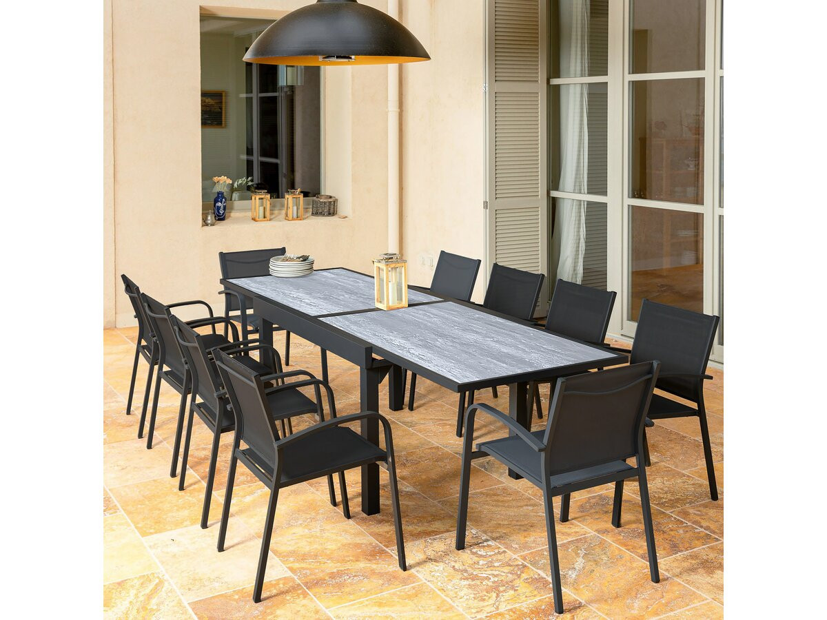 Table extensible "Lagos" - 200/320 x 105 x 76 cm - GrisTransformez vos moments de convivialité en une expérience exceptionnelle avec la table extensible "Lagos". Idéale pour ceux qui recherchent à la fois praticité et élégance, cette table est conçue pour répondre à tous vos besoins, qu'il s'agisse d'un dîner intime ou d'une grande réception.Fabriquée en aluminium robuste, la table "Lagos" allie légèreté et solidité, garantissant une utilisation durable aussi bien en intérieur qu'en extérieur. Grâce à son ingénieux mécanisme extensible, elle passe facilement de 200 x 105 x 76 cm à une longueur impressionnante de 320 cm, créant un espace généreux pour accueillir vos invités en toute simplicité.Son design moderne, sublimé par un coloris gris intemporel, s'adapte à tous les styles de décoration, du plus contemporain au plus classique. Table repas de jardin en aluminium extensible "Lagos" - Dimensions : 200/320 x 105 x 76 cm - Fonction extensible - Effet marbre - Traitement anti-UV et anti rouille - Poids : 51.2 kg - Métal - Gris .Descriptif: Table de repas Lagos - DimensionS : 200/320 x 105 x 76 cm - Fonction extensible - Effet marbre - Traitement anti-UV et anti rouille - Poids : 38 kg - Métal - Gris