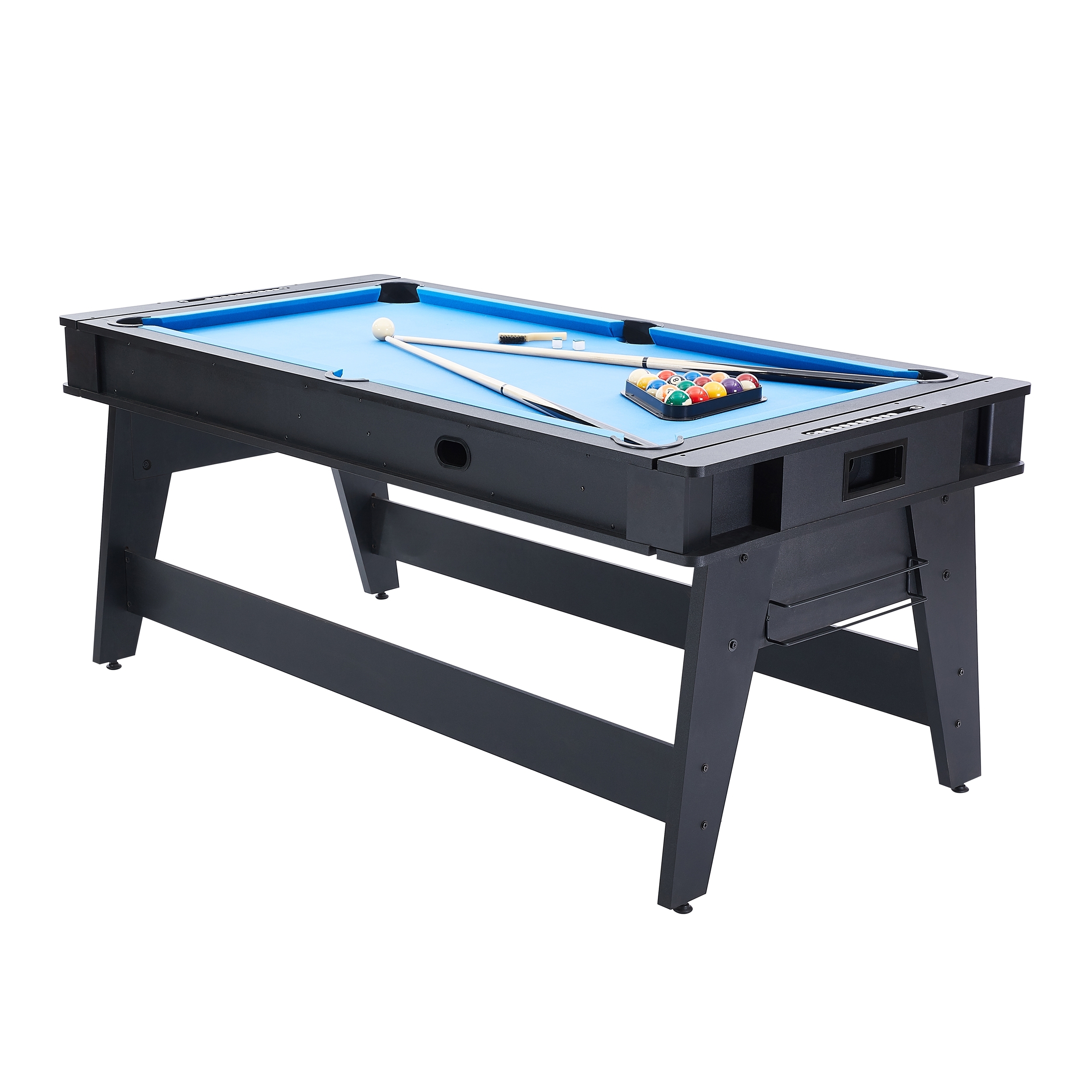 Pour ce qui est de la face billard 153,6 x 77,1 cm, vous apprécierez son tapis en velours. Vous disposerez de plus de 2 queues de billard 145 cm, des billes américaines numérotées Ø57 mm, un triangle et 2 craies. Quant à l'esthétique, elle vous plaira par sa sobriété, la structure noire s'adaptant à tous les styles de déco.