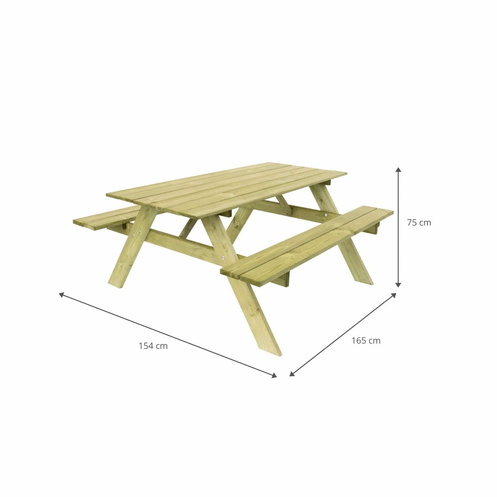 Table de pique-nique ESSENTIEL en bois traité de six places, fabriquée en planches de pin massif FSC (forêts durables) d'environ 2 cm d'épaisseur, avec traitement autoclave de type III qui la rend résistante aux intempéries et au mauvais temps. La table comprend deux bancs qui lui sont rattachés et qui peuvent accueillir 6 à 8 personnes au total. Conception très pratique, résistante et fonctionnelle. Ils conviennent comme mobilier extérieur dans les jardins, les patios, les parcs ou les espaces de pique-nique. La table est livrée démontée. Montage facile avec instructions de montage incluses. Les vis de montage sont incluses et les ancrages de plancher NE SONT PAS inclus. Montage environ 30 minutes 2 personnes. * N'oubliez pas que le traitement en autoclave ne garantit pas la préservation des nœuds que le bois peut présenter. Avec ce type de traitement, des taches blanches et des taches vertes peuvent apparaître, car en séchant, elles ressortent. Vous pouvez facilement l'enlever avec un chiffon humide ou du papier de verre fin. Caractéristiques : - Dimensions extérieures : 165 (L) x 154 (l) x 75 (H) cm. - Poids : 29 Kg. - Matériau : Bois massif traité. - Épaisseur : 2 cm dans la planche supérieure et 2,5 cm dans la structure environ. - Dispose de renforts intérieurs (croisillons). - Type d'assemblage : Vis, écrous et rondelles. - Couleur : bois naturel. - Espace recommandé : 170x160x80 cm.