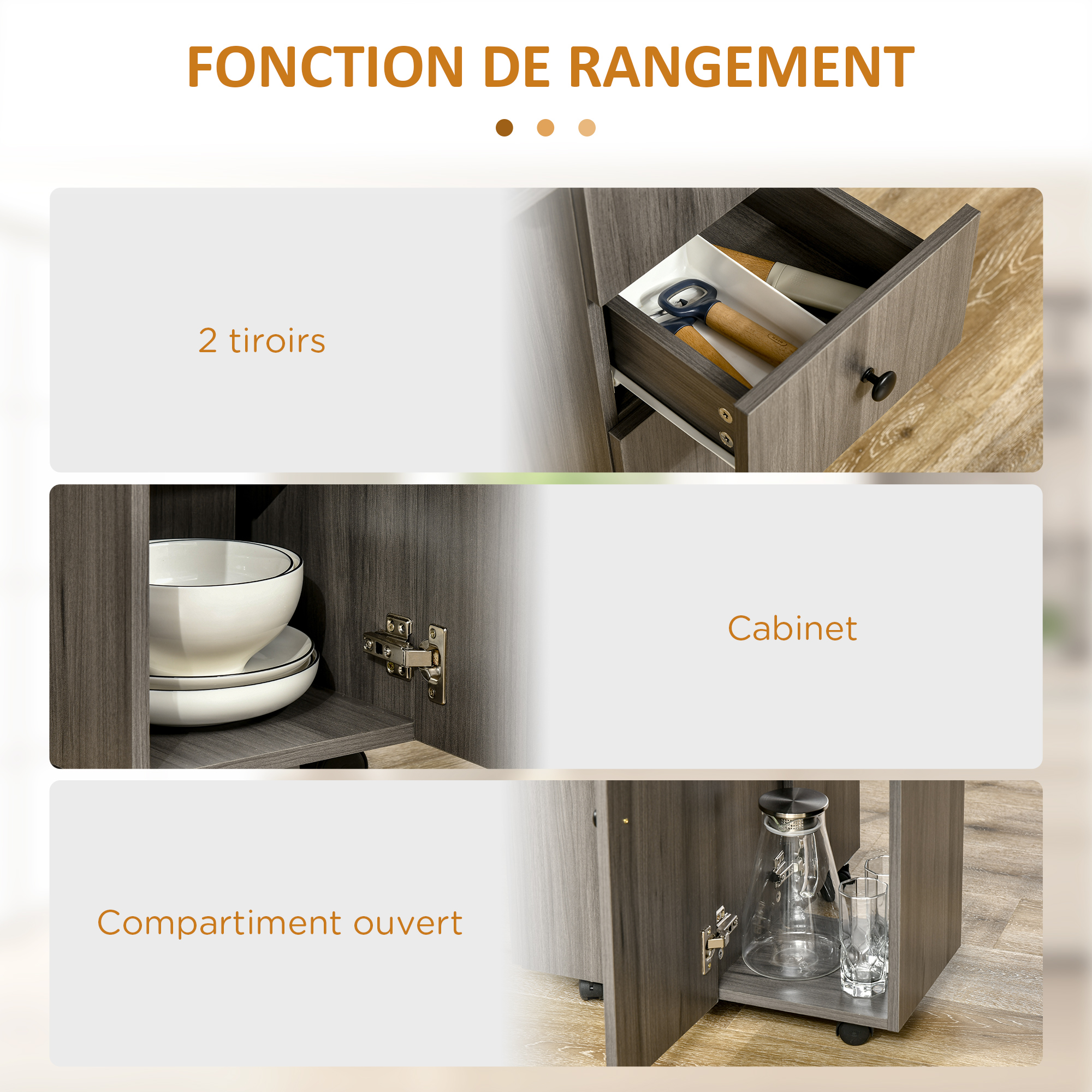 - 4 espaces de rangement intégrés au niveau de l'îlot central : 2 tiroirs coulissants, placard porte, niche