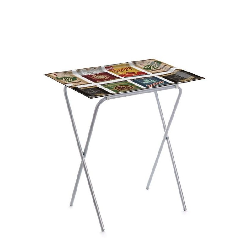 PETITE TABLE PLIANTE AVEC PLATEAU AMOVIBLE, ADATable pliante idéale pour manger dans le fauteuil. Parfaite pour l'utiliser comme table d'appoint sur la terrasse, le balcon, à la piscine, au camping, ect.... Excellente résistance et durabilité.Pliage facile. Les pieds de la table se fixent au plateau supérieur à pression.Le plateau peut être utilisé comme plateau de service une fois que les pieds ont été enlevés.Occupe très peu d'espace une fois pliée.Pieds métallique avec revêtement en poudre de polyester couleur gris aluminium pour éviter la corrosion dans les environnements humides et garantir une longue durée de vie pendant de nombreuses années.Plateau de 62 x 42 cm. en bois stratifié, résistant aux hautes températures, produits de nettoyage...Différents motifs disponibles.Large gamme de décorations de plateaux disponibles.Produit léger et stable. Table facile d'entretien.Résistance aux taches et nettoyage facile. Astuces:- Utilisez un chiffon humide.- N'utilisez pas de produits de nettoyage chimiques.Dimensions de la table ouverte: 65,5 ( Hauteur ) 61,5 (Largeur ) 42 ( Profondeur ) cm.Belle table d'appoint, pratique et compacte. Idéale pour un balcon ou une terrasse.