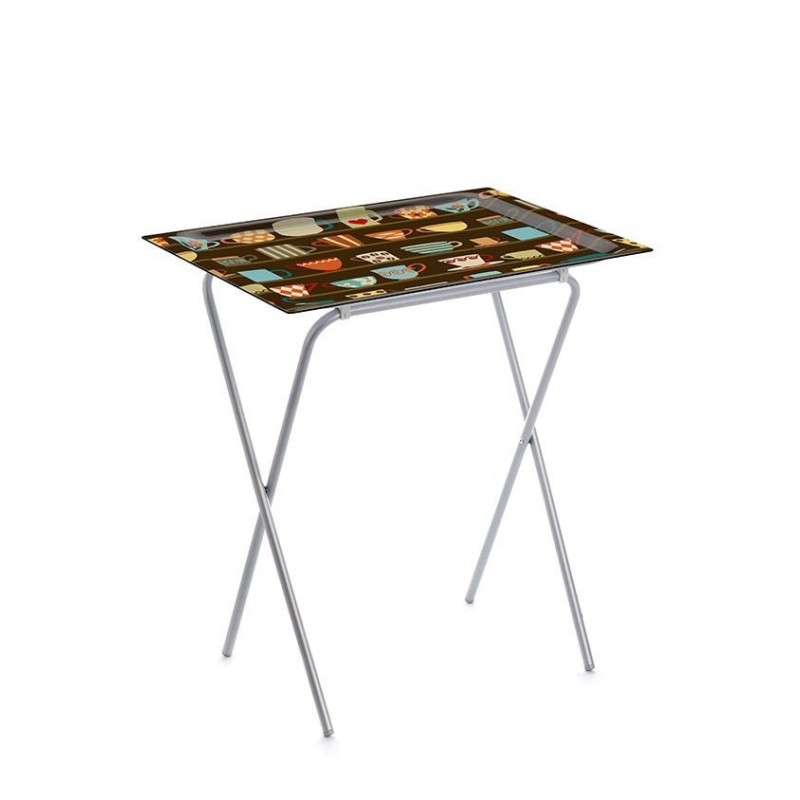 PETITE TABLE PLIANTE AVEC PLATEAU AMOVIBLE, ADATable pliante idéale pour manger dans le fauteuil. Parfaite pour l'utiliser comme table d'appoint sur la terrasse, le balcon, à la piscine, au camping, ect.... Excellente résistance et durabilité.Pliage facile. Les pieds de la table se fixent au plateau supérieur à pression.Le plateau peut être utilisé comme plateau de service une fois que les pieds ont été enlevés.Occupe très peu d'espace une fois pliée.Pieds métallique avec revêtement en poudre de polyester couleur gris aluminium pour éviter la corrosion dans les environnements humides et garantir une longue durée de vie pendant de nombreuses années.Plateau de 62 x 42 cm. en bois stratifié, résistant aux hautes températures, produits de nettoyage...Différents motifs disponibles.Large gamme de décorations de plateaux disponibles.Produit léger et stable. Table facile d'entretien.Résistance aux taches et nettoyage facile. Astuces:- Utilisez un chiffon humide.- N'utilisez pas de produits de nettoyage chimiques.Dimensions de la table ouverte: 65,5 ( Hauteur ) 61,5 (Largeur ) 42 ( Profondeur ) cm.Belle table d'appoint, pratique et compacte. Idéale pour un balcon ou une terrasse.