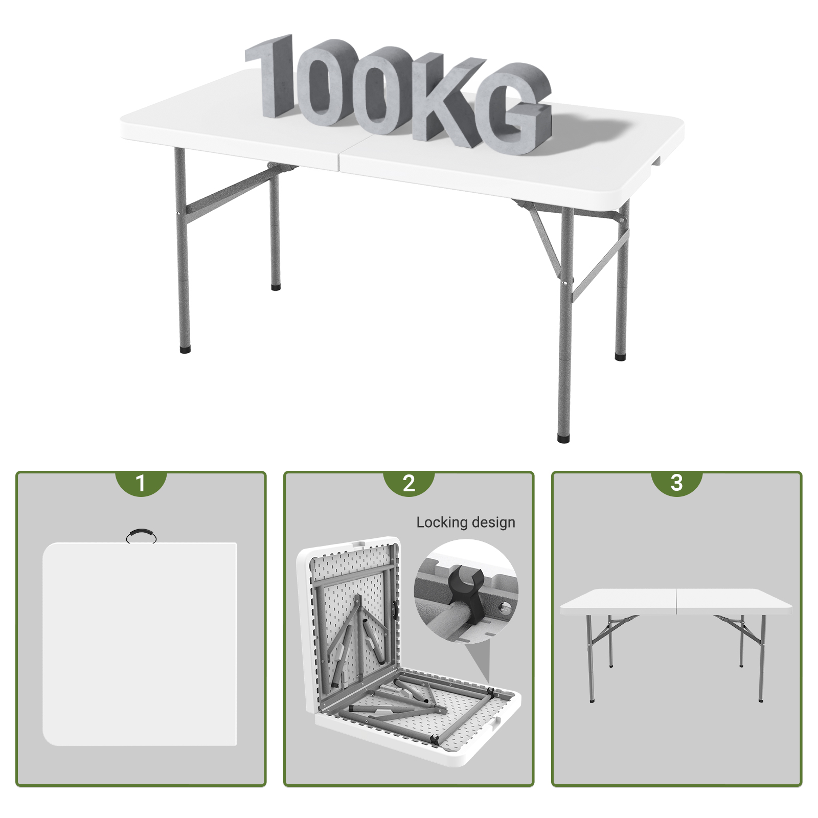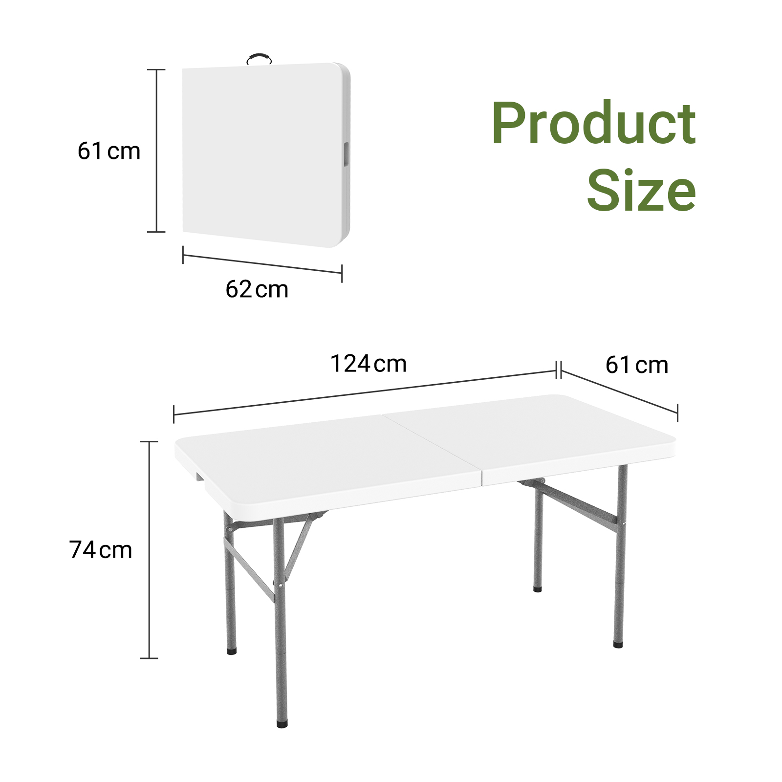 | Libellé | Table Pliante Transportable, Table en Plastique Robuste, 124 x 61 cm, Blanc, Pliable en deux, Matériau: HDPE |