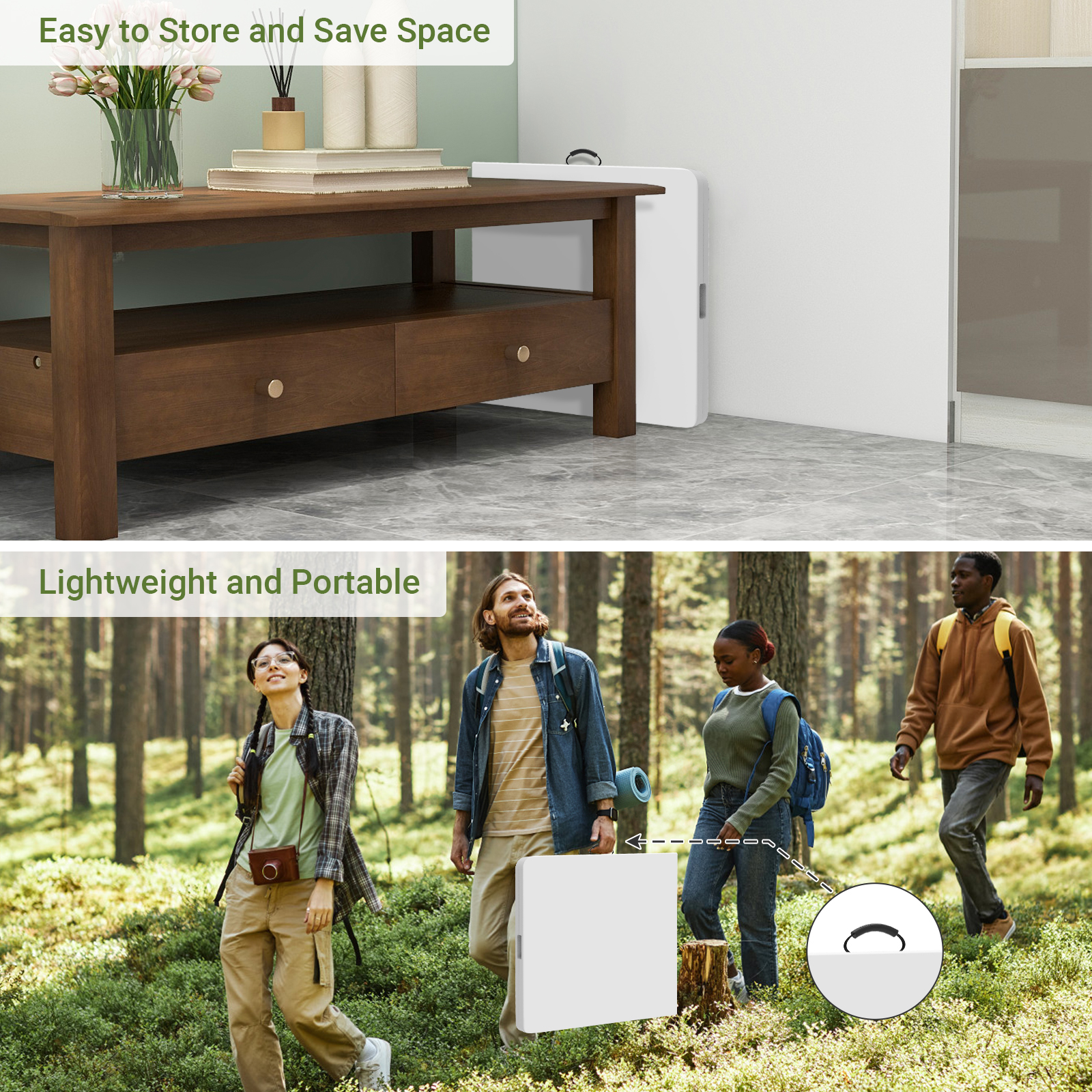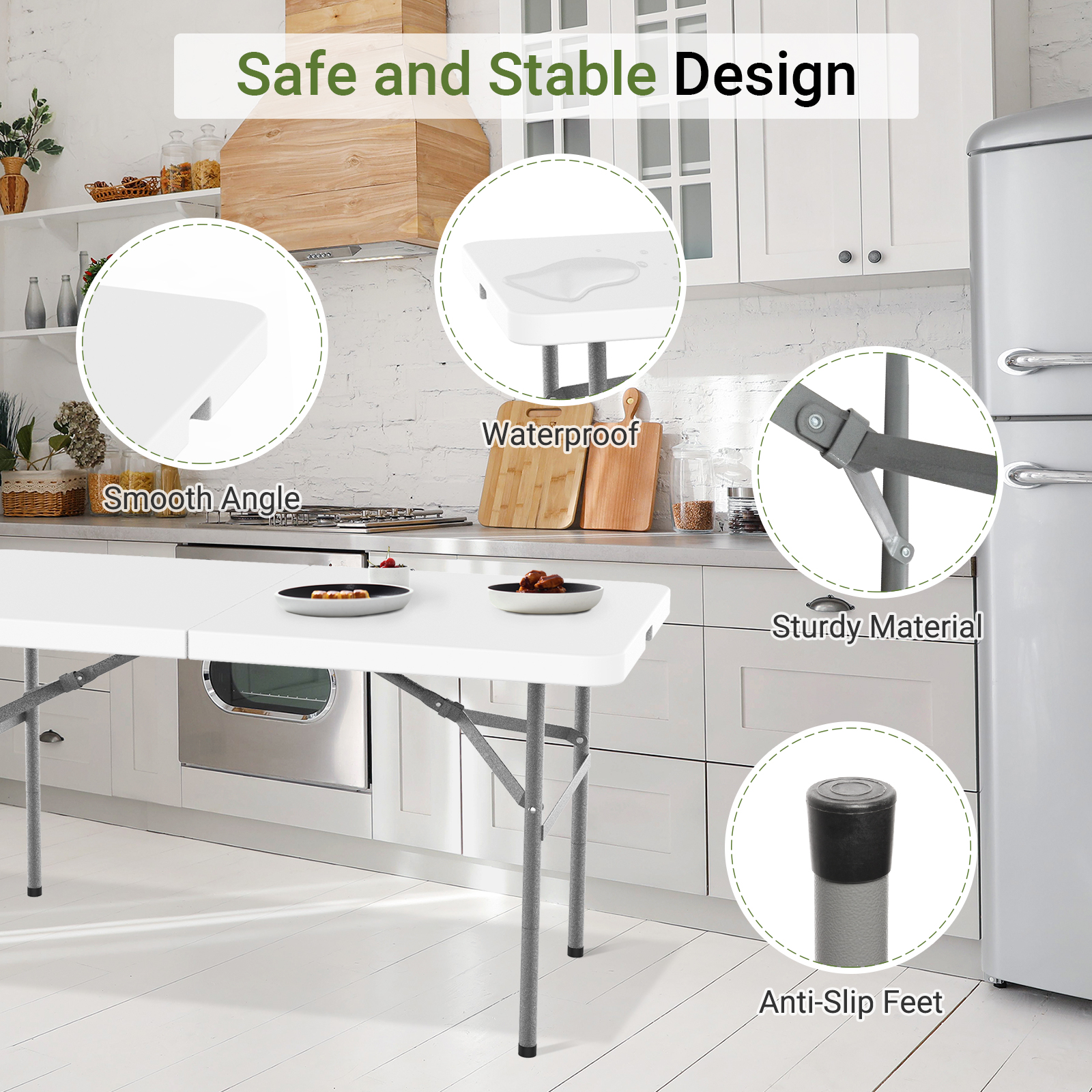 Pour une meilleure organisation de vos réceptions, choisissez cette table pliante confortable à grande capacité. Cette table est un atout majeur pour la réussite de vos réceptions et repas de familles. Sa stabilité et sa robustesse sont dues à ses pieds antidérapants. La surface légère, durable et résistante aux taches contient des inhibiteurs d'UV pour une utilisation en extérieur en toute sérénité. Facile à nettoyer, n'ayez pas peur des aléas de la vie, et tachez ou renversez ce que vous voulez sur la table. En plus de ces fonctionnalités, ne craignez pas non plus de rayer votre sol ou votre magnifique parquet. Pour plus de commodité, la table est pliable et est équipée d'une poignée, facilitant le transport. Vous pouvez ainsi la glisser dans votre coffre sans qu'elle ne prenne trop de place.