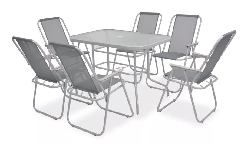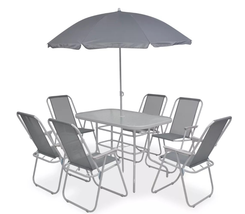 | Libellé | Table rectangulaire avec parasol et 6 chaises de jardin métal gris Castle |