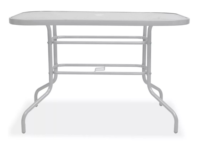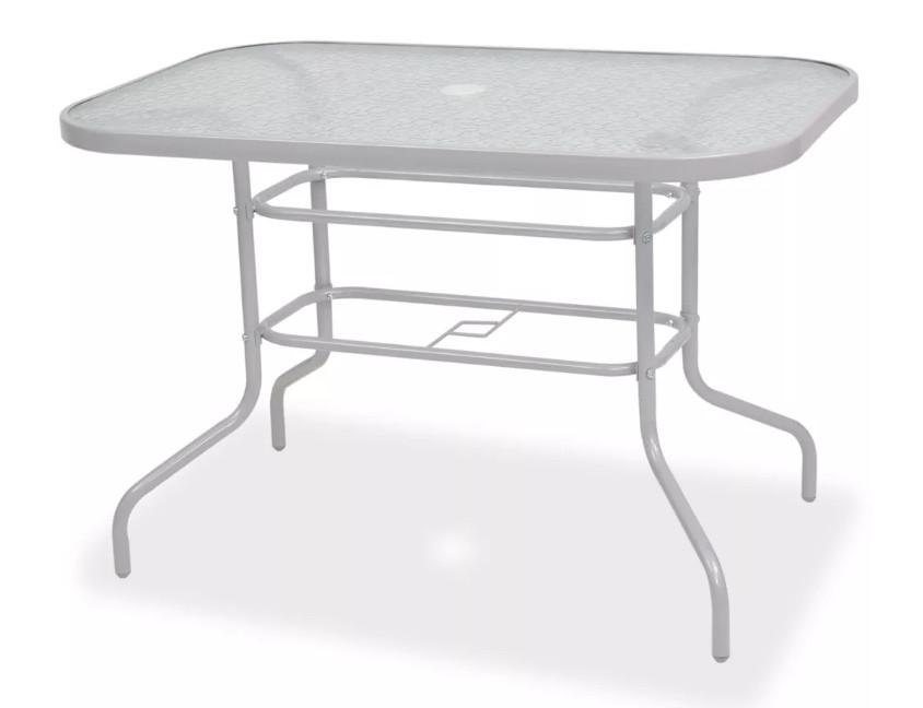 Élégant et moderne, cet ensemble de mobilier d'extérieur est conçu entièrement avec du métal peint en gris. Il est composé d'une table rectangulaire avec un plateau en verre trempé avec une texture de vague d'eau, d'un parasol et de 4 chaises. Ce modèle est également disponible en d'autres dimensions et en d'autres couleurs. Il existe aussi d'autres ensembles de table et de chaises que vous pourrez découvrir sur notre site. Et vous pouvez aussi acheter les éléments séparément.