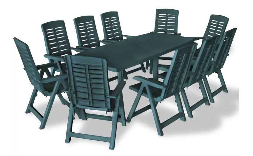 Cet ensemble de table et de chaises de jardin apportera une touche moderne à votre espace de vie extérieur. La table et les chaises sont conçues avec du plastique de haute qualité. L'ensemble est composé d'une table rectangulaire et de 10 chaises avec un dossier réglable. Il existe aussi d'autres ensembles de table et de chaises que vous pourrez découvrir sur notre site. Et vous pouvez aussi acheter les éléments séparément. Caractéristiques de la table : Dimensions : L 210 x H 72 x P 96 cm Couleur : Vert Matériau : Plastique Caractéristiques des chaises : Dimensions : L 60 x H 108 x P 61 cm Dimensions du siège : L 45 x H 44 x P 49.5 cm Hauteur des accoudoirs : 63 cm Couleur : Vert Matériau : Plastique