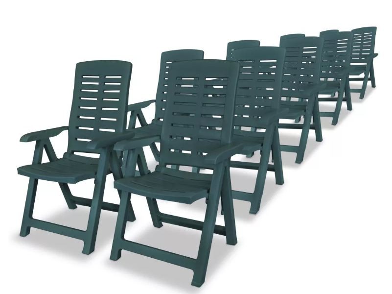 Cet ensemble de table et de chaises de jardin apportera une touche moderne à votre espace de vie extérieur. La table et les chaises sont conçues avec du plastique de haute qualité. L'ensemble est composé d'une table rectangulaire et de 10 chaises avec un dossier réglable. Il existe aussi d'autres ensembles de table et de chaises que vous pourrez découvrir sur notre site. Et vous pouvez aussi acheter les éléments séparément. Caractéristiques de la table : Dimensions : L 210 x H 72 x P 96 cm Couleur : Vert Matériau : Plastique Caractéristiques des chaises : Dimensions : L 60 x H 108 x P 61 cm Dimensions du siège : L 45 x H 44 x P 49.5 cm Hauteur des accoudoirs : 63 cm Couleur : Vert Matériau : Plastique