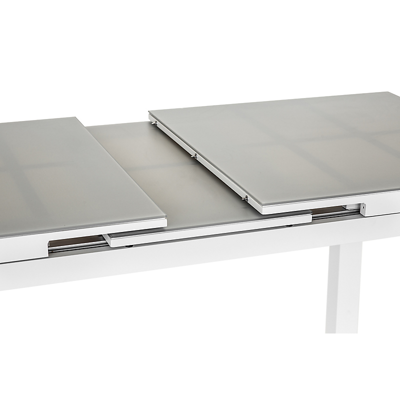 Table de jardin extensible Ibiza gris perle JARDILINE. Structure aluminium et plateau en verre texturé fumé anti-rayures. Rallonge automatique. Pour 8 à 10 personnes. Dimensions de la table : 180/240x100x76 cm. S'associe parfaitement aux fauteuils Ibiza gris perle JARDILINE.
